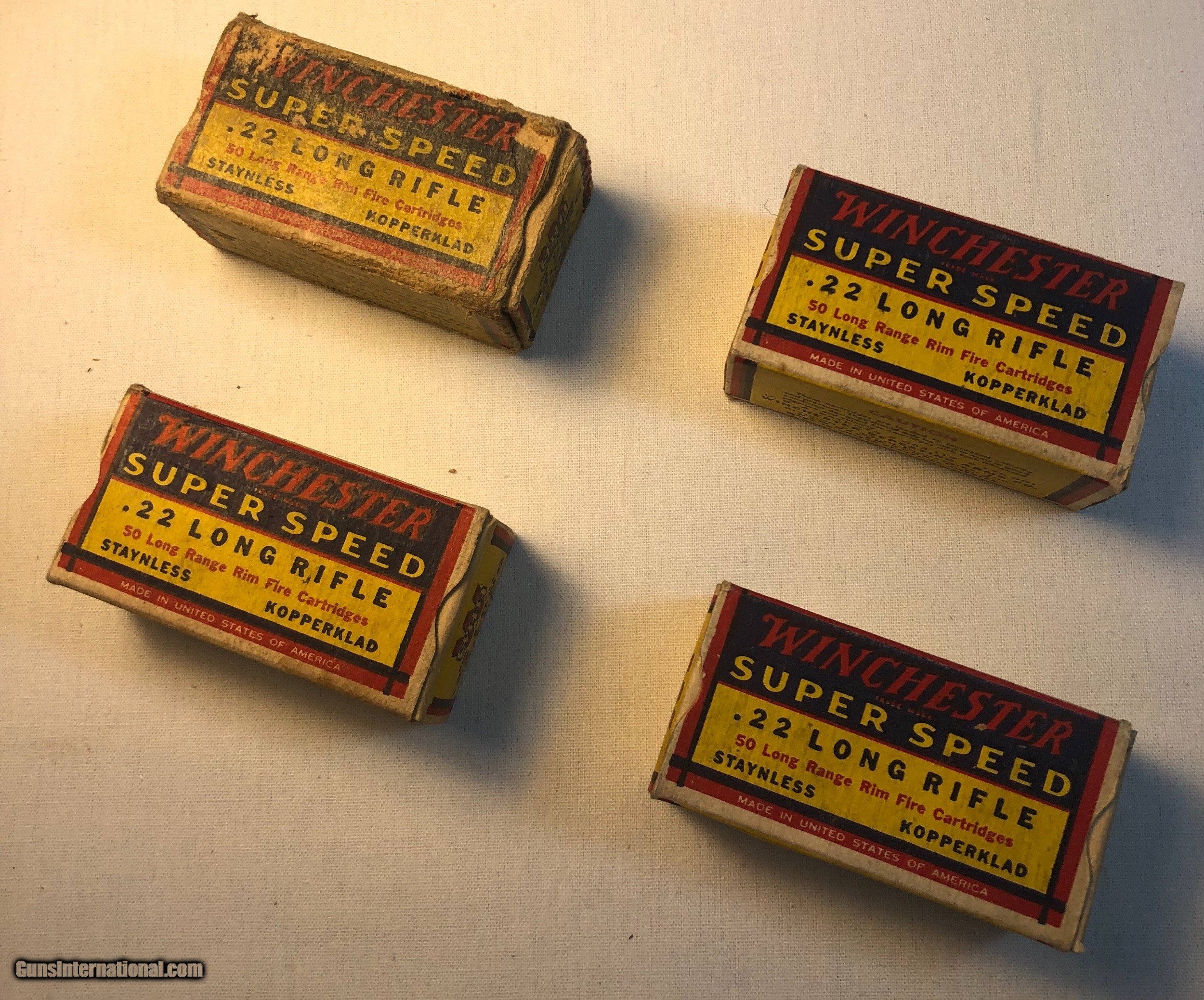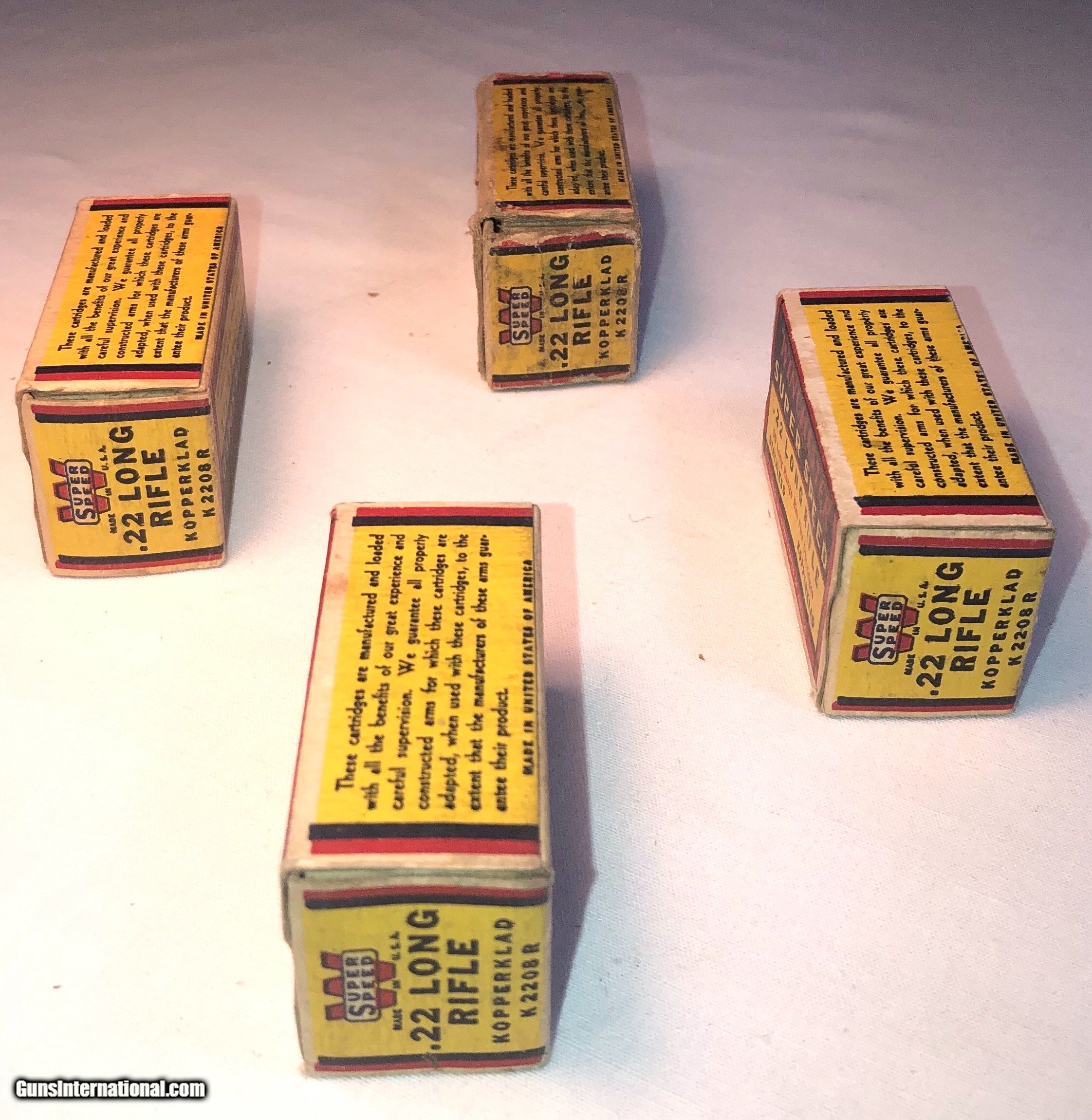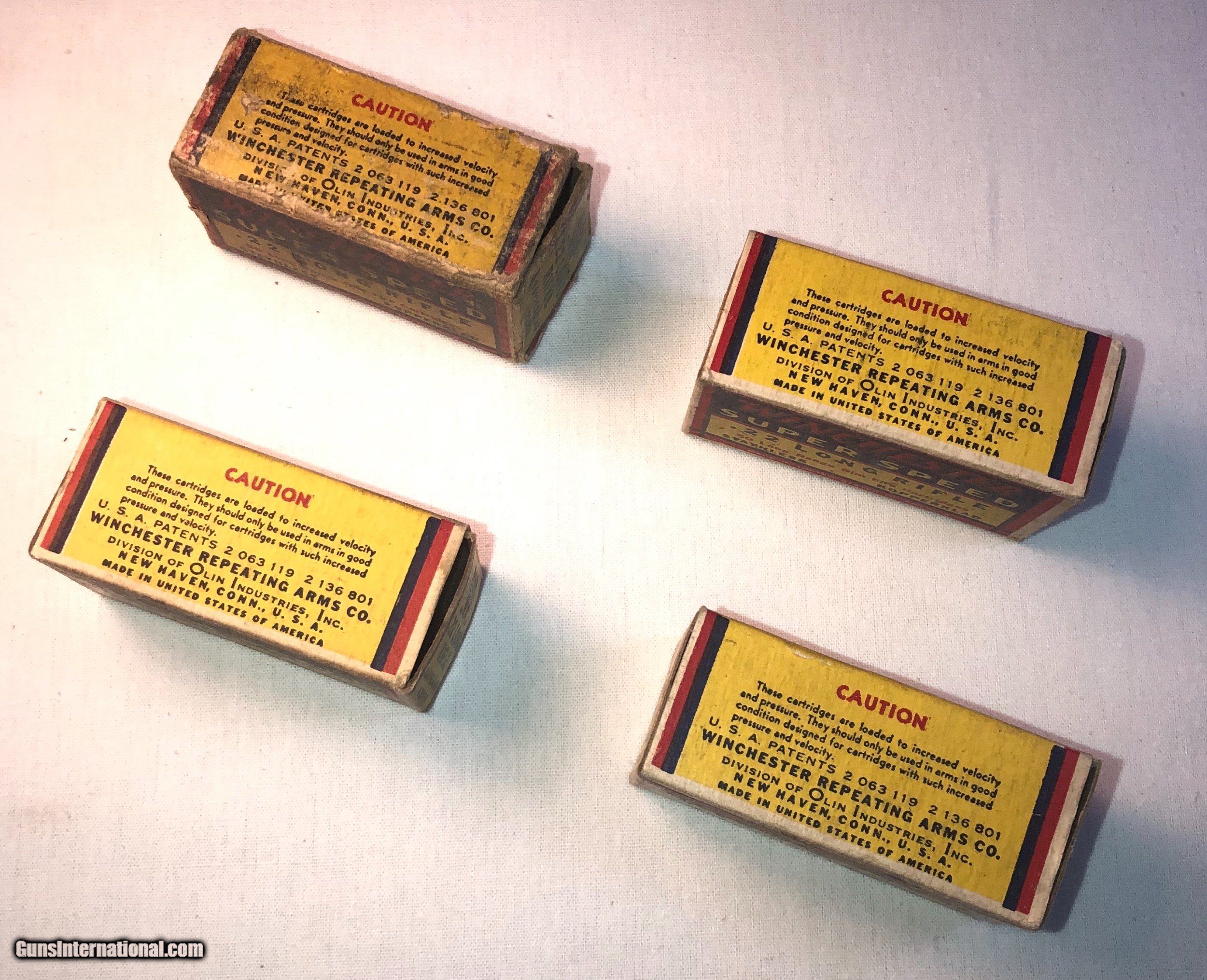 Description: These Winchester ammunition boxes are full and are fine examples of Winchester’s second variety of this type established in 1938. This bundle includes 4 boxes for one money! Ground shipping is included to the lower 48 states. This ammunition is sold as a collectors item only and we make no quarantees to its quality or functionality. Please know and abide by your local laws in regards to purchasing ammunition. Adult signature age 21 or over required at point of receipt. SOLD |