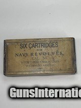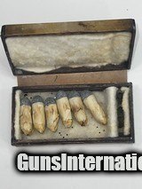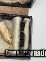 Description: Unbelivable, A full box of paper cartridges complete with the primers and the originalcotton padding for protection. The label indicates in small print that they were made in the Watervliet Arsenal and dated 1863. That was right at the height of the Civil war. The box does show some slighht handling, however the contents are complete. What a find for the Civil War collector or the Cartidge collector . It is certainly a complement to the collector or a Centerpiece for a cartidge display . Modestly priced at $395. OBO Price: $395.00 Buy Now Contact Seller |