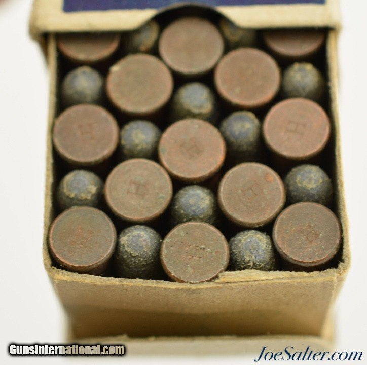 Description: This is a full box, 50 original rounds, of .22 LR ammunition manufactured by Winchester as part of the 1927 Staynless Made in U.S.A. issues. The box is marked on the inside flap "Army Lot 67" and was part of a US Military contract. In excellent condition the blue, red and white box has excellent graphics with bright colors. The cartridges are in near excellent condition with some age darkening. Identified as WRA-12B LR-1 in Roger Huegel's online .22 Rim Fire Box ID Reference based on the original Dunn classification system. Price: $165.00 Contact Seller |