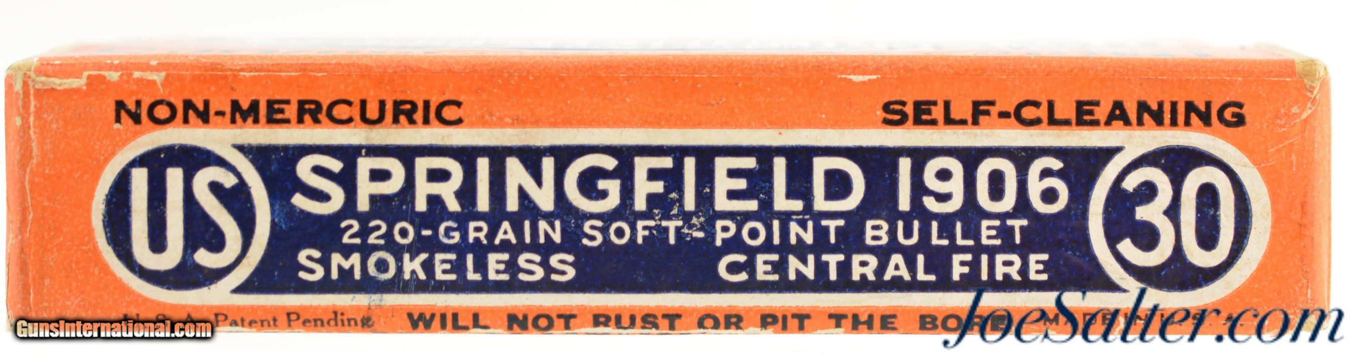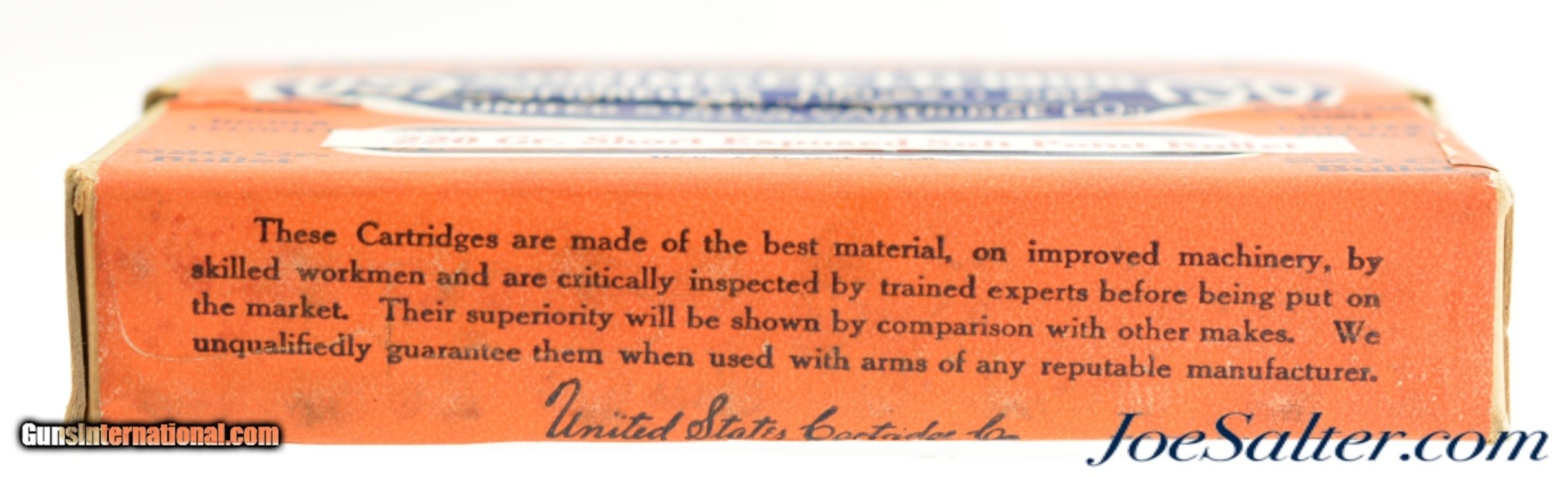 Description: This is a full and sealed box of .30 Springfield 1906 (.30-06) ammunition manufactured by the US Cartridge Co. with 220 grain short exposed soft point bullets. The two piece orange, blue and white box has an excellent label with bright colors and crisp graphics that has the added over-label with call out for the special bullet loading. The box is in excellent condition with only very slight shelf and handling wear. An excellent example with a scarce loading that will look great in any collection. Price: $125.00 Contact Seller |