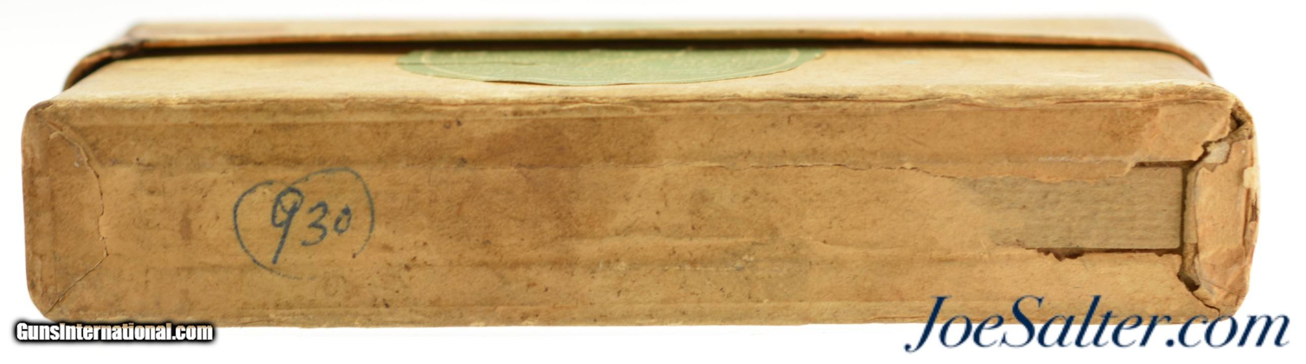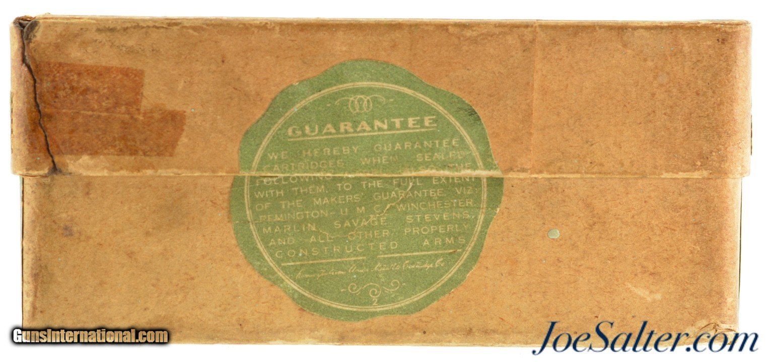 Description: This is a full box, 20 original rounds, of .38-56 black powder ammunition manufactured by Rem UMC with 255 grain bullets. The two piece combined red ball logo box has very fine graphics with an excellent cartridge cut that calls out Winchester & Marlin rifles. The box has an older repair on the top right portion with some now stable separation with a few small bits of paper missing. The label shows some overall soiling with very good color. The cartridges all have the correct "U" primers and semi-jacketed soft point bullets. A great box to pair with a rifle. Price: $245.00 Contact Seller |