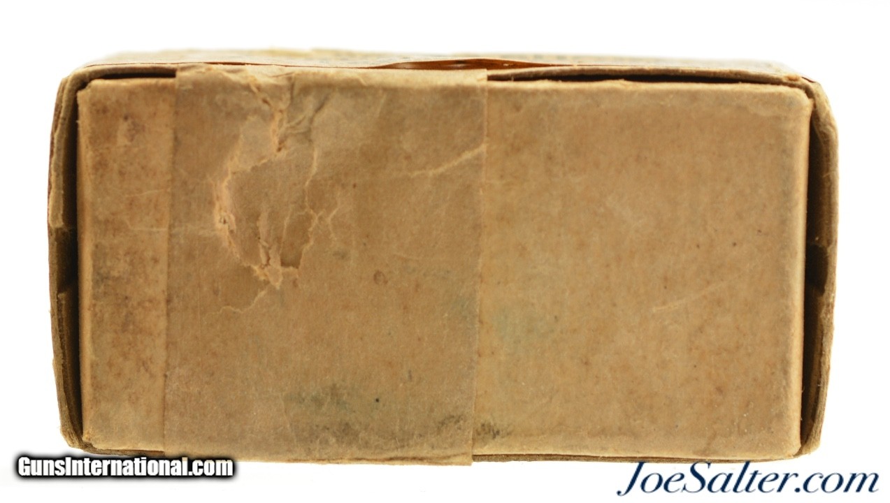Description: This is a full and sealed, 50 original rounds, of .22 Short ammunition manufactured by Winchester and is part of the 1914 issue. The two piece buff box with green and black primary and white and black side seal with red "W" remains factory sealed with intact primary and side labels having excellent graphics and an excellent cartridge cut with "11-16" date code on the top and "9-14" on the side. The box shows light edge wear and overall mild age soiling with a bottom indent / crush about the size of a dime. Price: $110.00 Contact Seller |