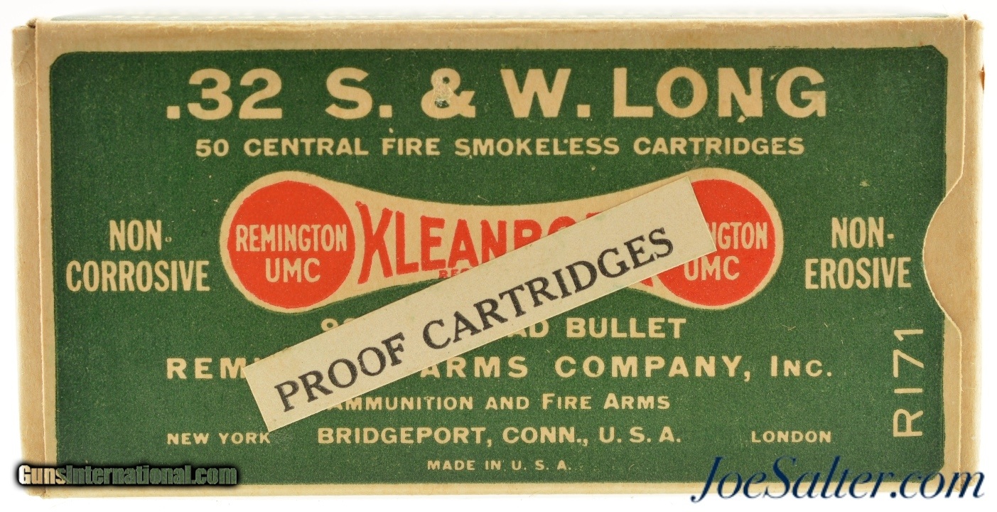Description: This is a full, 50 original rounds, of .32 S&W Long Proof Cartridges manufactured by Remington UMC. The early 1930's "Dog Bone" Kleanbore, one piece box has "R171" load index code and "Proof Cartridges" sticker over 3 sides and ink overprint on the bottom. This is an excellent box, crisp in every way that is fresh from a brick. The cartridges are in excellent condition and have the black factory coating to identify them as proof loads. These were purportedly from the H&R factory collection. A very rare proof load in a desirable box that is in excellent condition. Price: $85.00 Contact Seller |