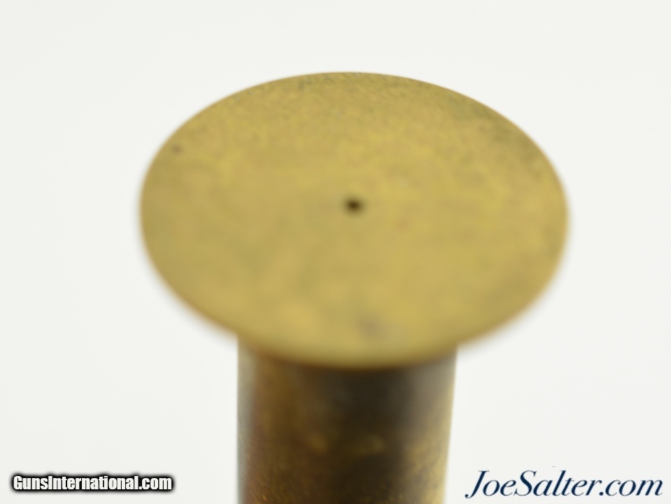 Description: This is an early "1865" style, wide, flat soldered head 36 caliber Maynard cartridge. In near excellent condition the cartridge shows some age darkening and bullet lube oxidation. A very nice Civil War era cartridge. Price: $65.00 Contact Seller |