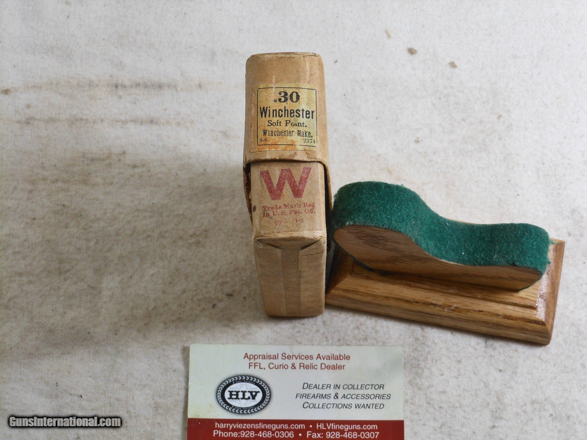 Description: This Winchester box has very fine bright original shells. These shells are the early style 30 W.C.F cartridges. The Box label has the 8th month of 1906 Label date. This box is in very fine original condition. There is no damage to this box. The front label is bright and colorful. The top label is slightly faded. The end labels are intact. This is a really nice early box for the 1894 rifles and carbines! This box will display well! LEE (1) F. No. 801 -26 Rifle Caliber: .30-30 Winchester Price: $350.00 Contact Seller |