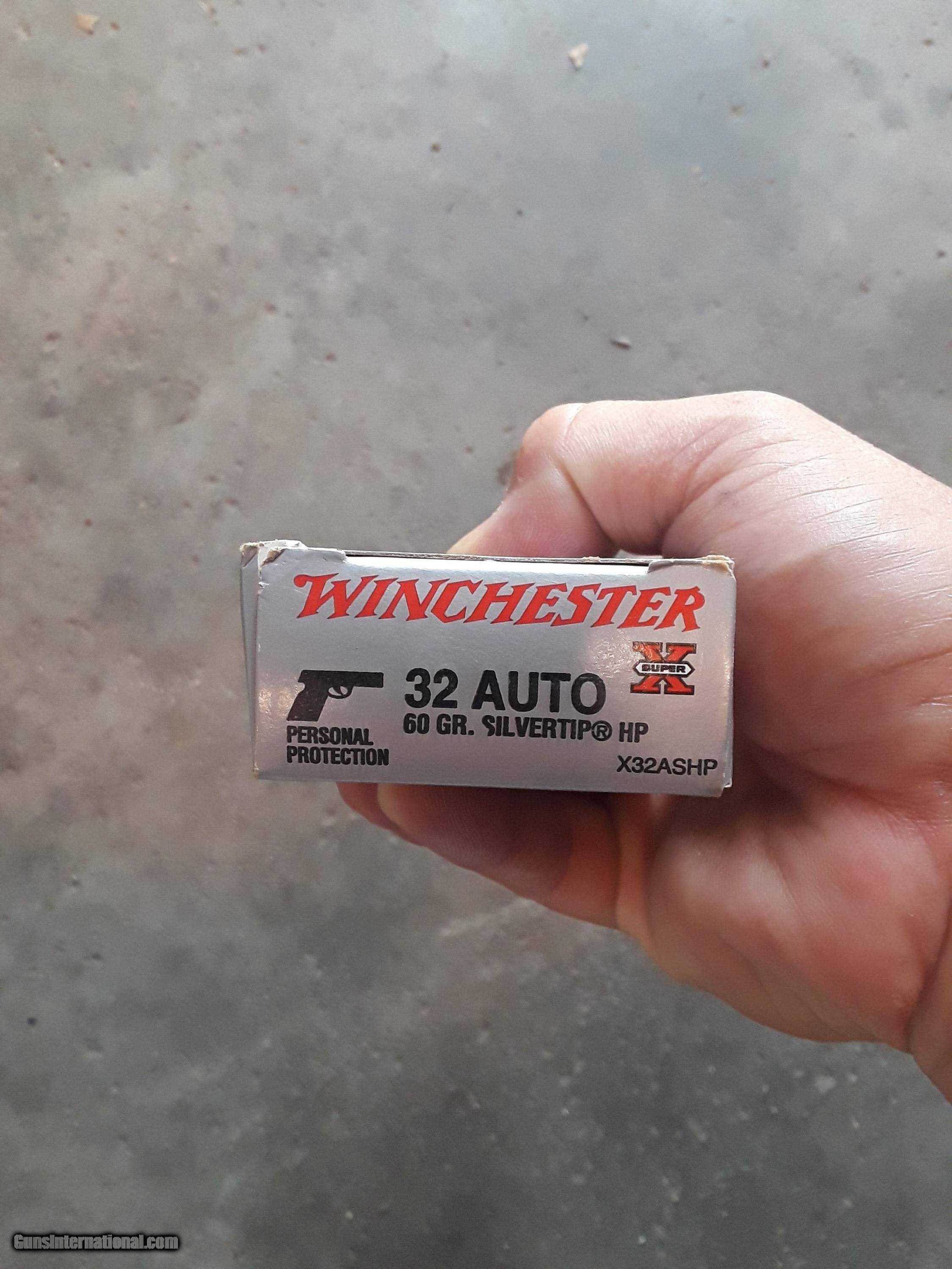 Description: Winchester .32 ACP - Silvertip 3 × 50 $40/box (see picture) * $30 for exact shipping with overage promptly refunded. I will forward a copy of the shipping receipt as well. SOLD Handgun Caliber: .32 ACP (7.65x17mm Browning SR) |