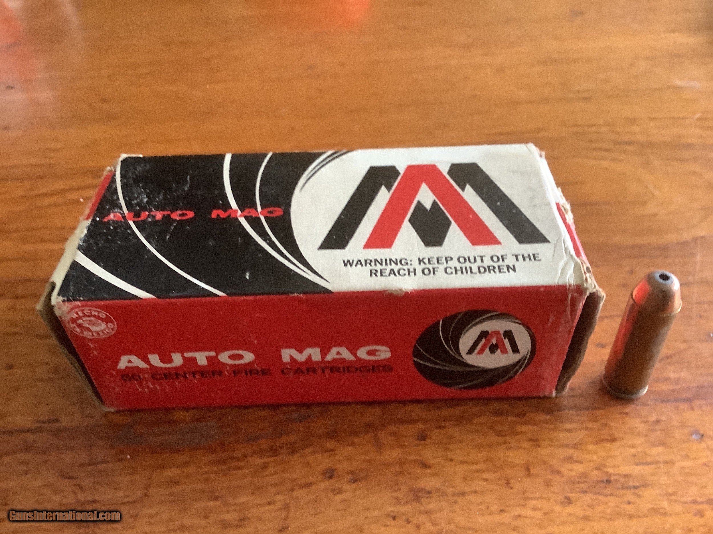 Description: 4x50 round boxes; for Auto Mag Pistol; .44AMP; 240 gr. JHP; excellent condition; boxes very good condition. Manufactured for Auto Mag by Cartuchos de Deportiva, Morelos, Mexico SOLD |