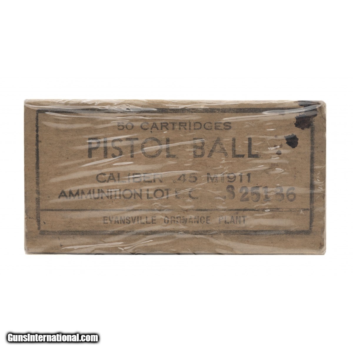 Military .45 M1911 Pistol Ball Ammunition by Evansville Ordnance dated 1943.Full box of 50 steel case rds