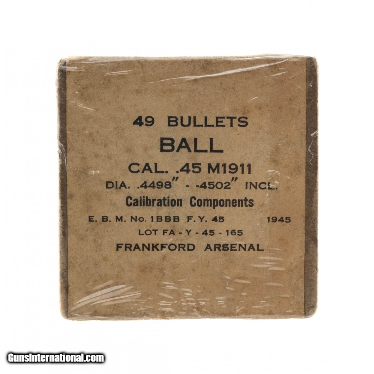 Description: " 49 BULLETS Ball Cal. M1911 from Frankford Arsenal Dated 1945. Full Box of 49. SOLD |