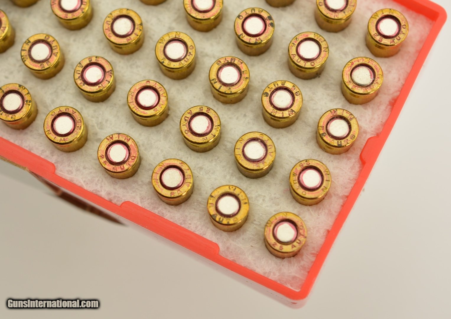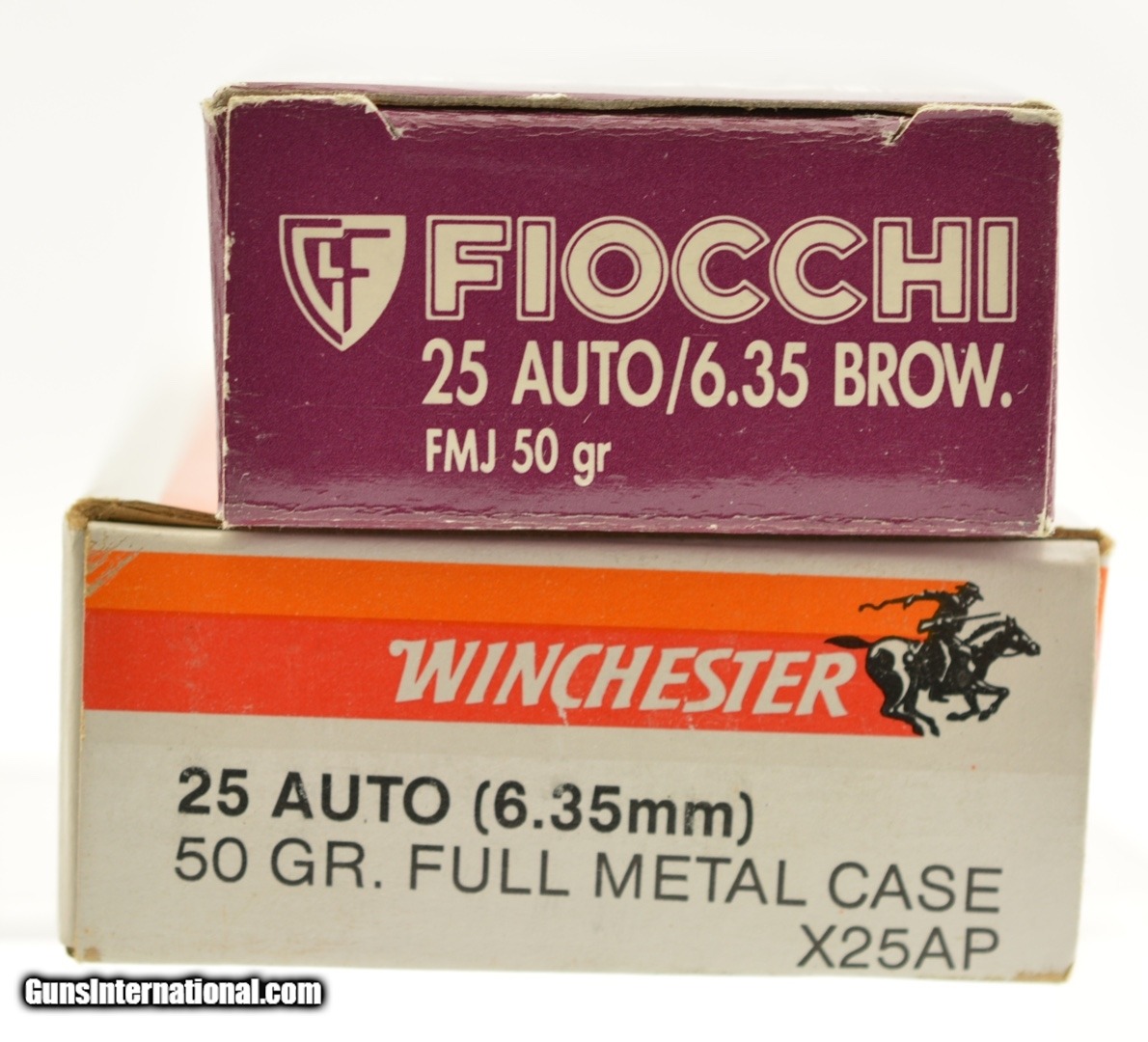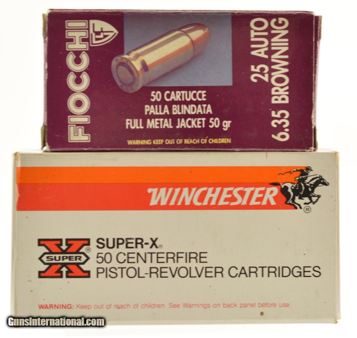 Description: This is a 2 NOS boxes of 25 Auto/6.35mm, one Winchester 50gr. FMJ X25AP and one box of Fiocchi 50gr. FMJ. SOLD |