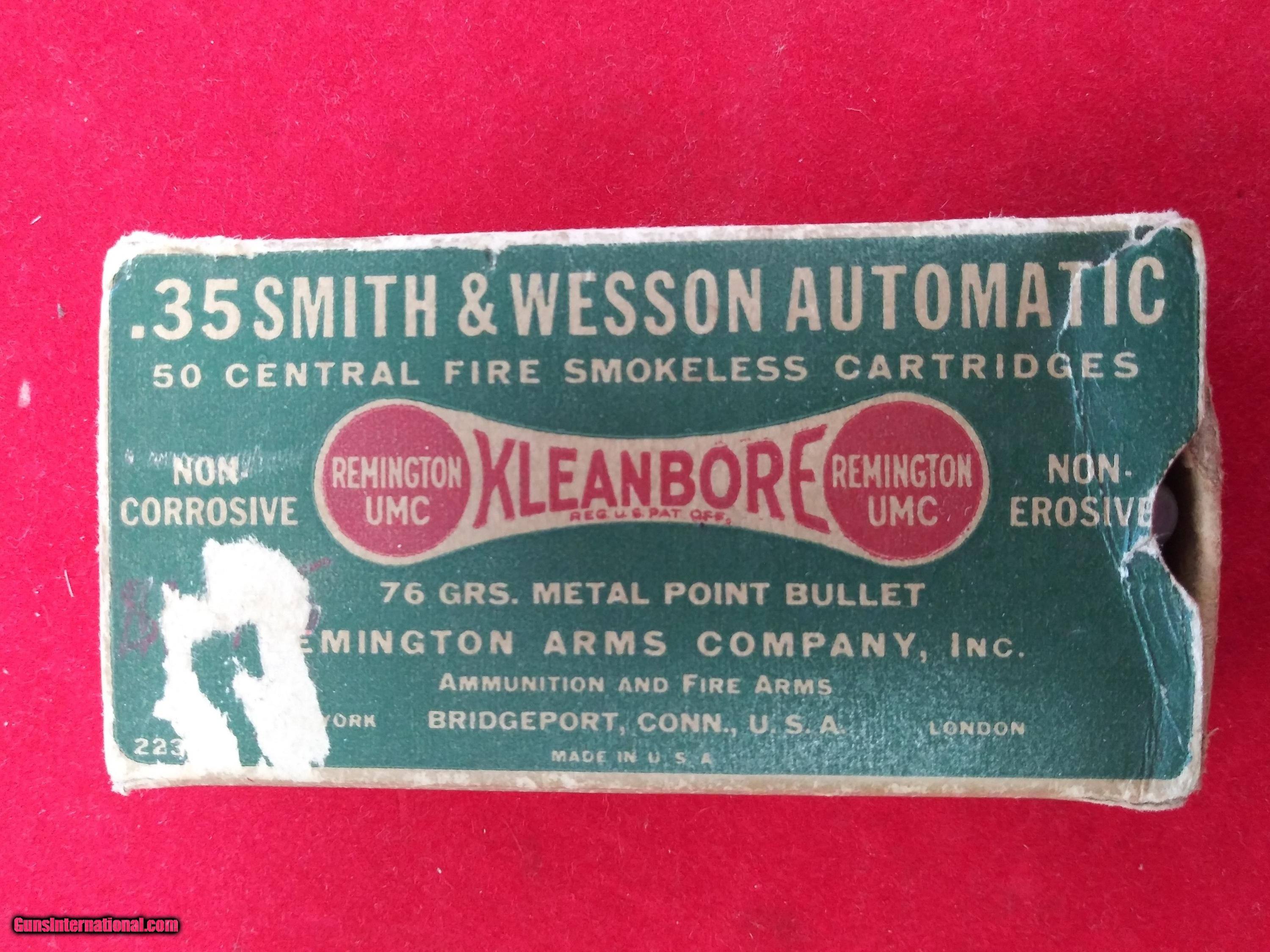 Description: 37 rounds. Remington Kleanbore .35 Smith & Wesson Automatic ammunition. 76 grain FMJ. Both ends of the box are missing, as shown in pics. $100 includes shipping to lower 48 states. Not CA or NY. Please E-mail, or click "buy it now".. SOLD Handgun Caliber: .35 S&W Auto (.35 Automatic) |