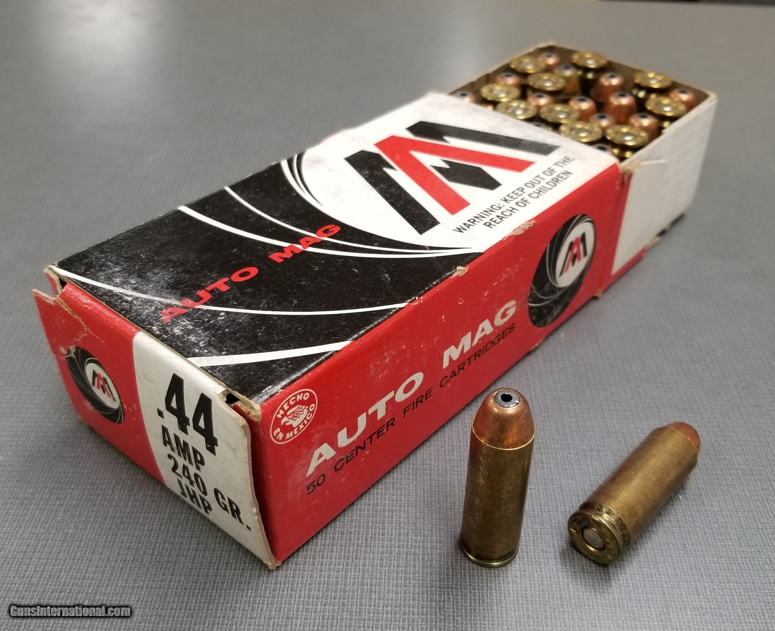 Description: AUTO MAG .44AMP 240GR JHP. $89.99 PER BOX. S&H $15.00 FOR 1-3 BOXES S&H $30.00 FOR 4+ BOXES ADD 3% FOR CREDIT CARDS SOLD Handgun Caliber: .44 Auto Mag |
