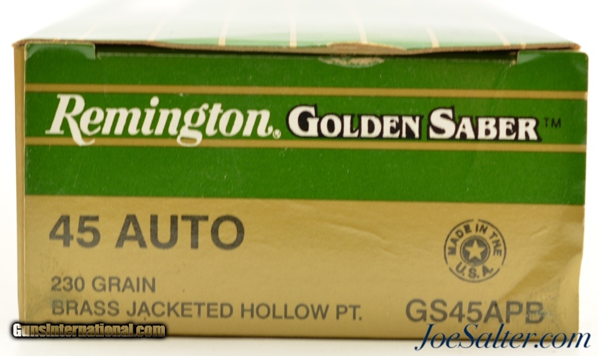 Description: This is One NOS box of 50 Remington Golden Saber 45ACP 230gr HPJ GS45APB. This uses the High Performance Jacket bullet.; SOLD |