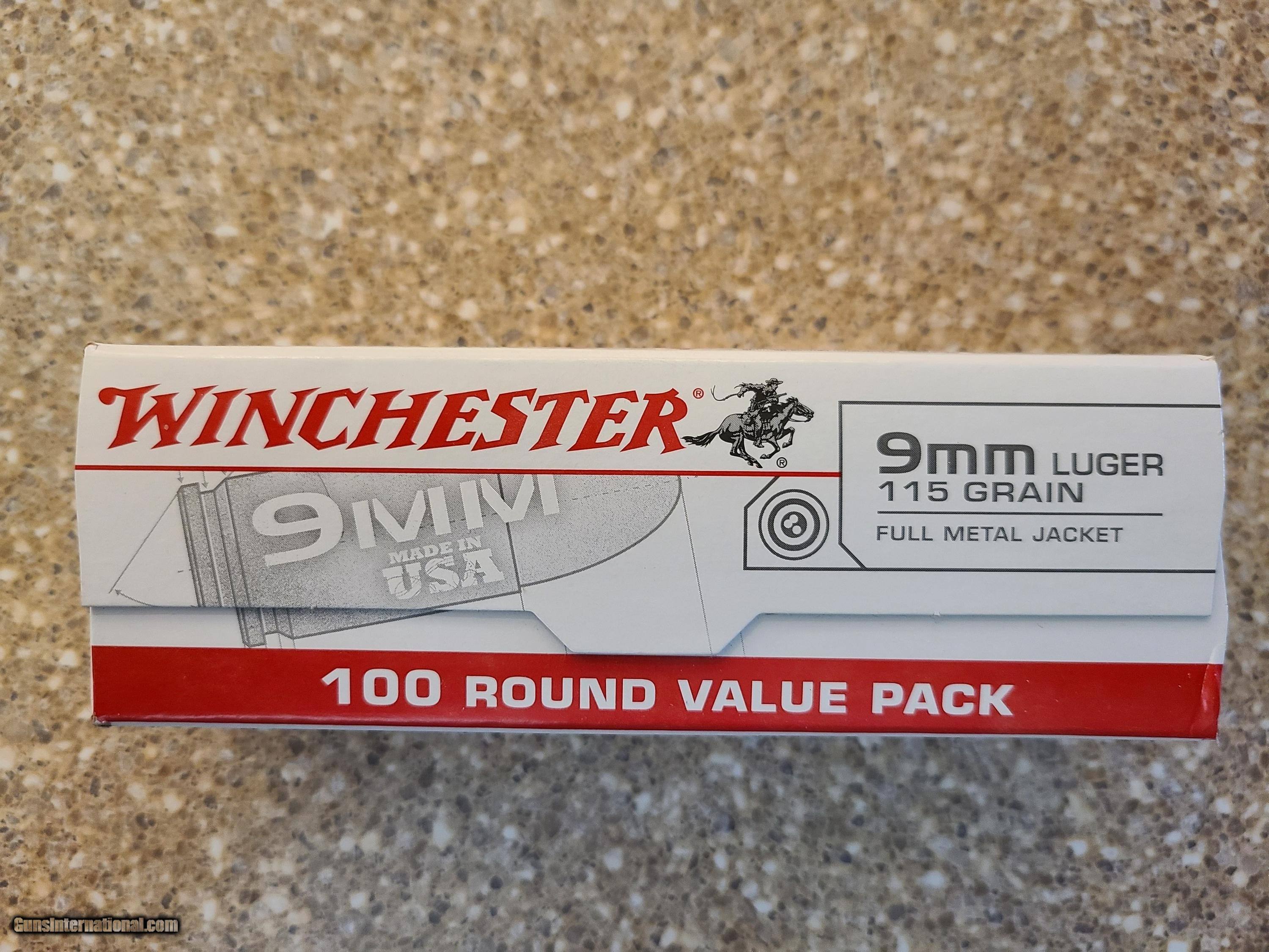 Winchester 9mm Luger 115 Grain FMJ Brass Box of (100) Rounds Free Shipping