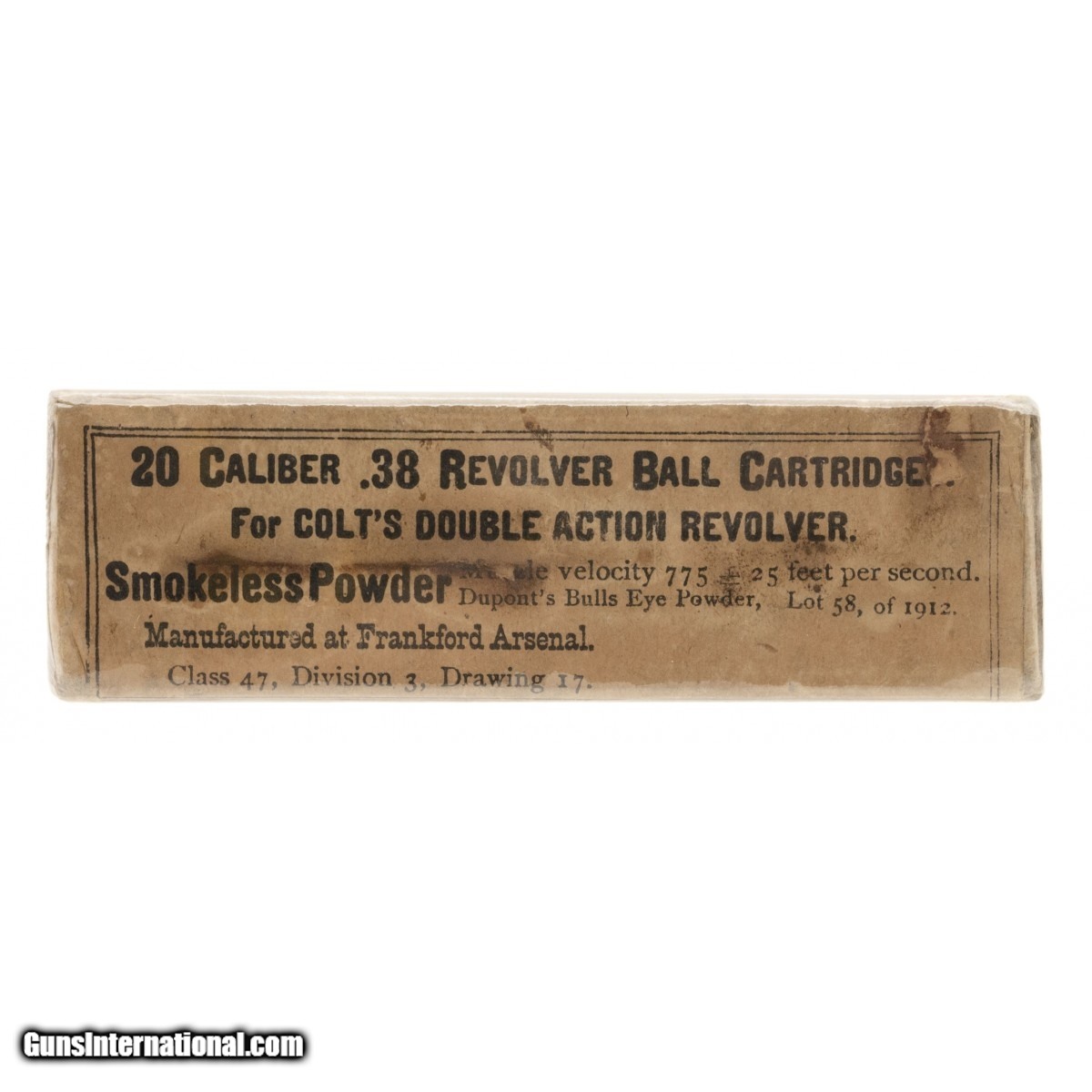 Description: " .38 Caliber Revolver Ball Cartridges for Colt`s Double action Revolver. Manufactured At Frankford Arsenal. Full Sealed Box of 20 Dated 1912. SOLD |