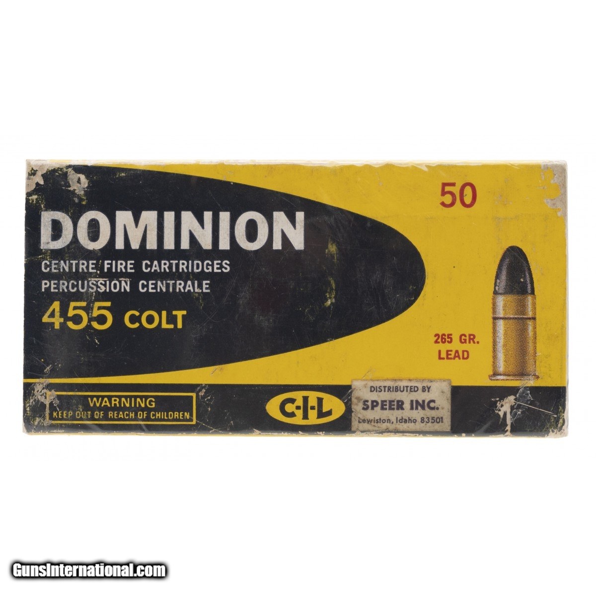 Description: " 455 Colt CF Cartridges By Dominion Box Missing One Shell. Box of 49 Shells. SOLD |
