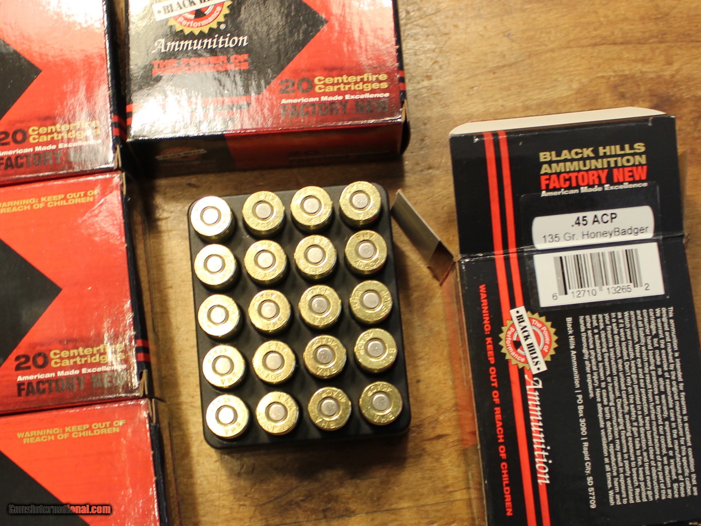 100 rounds of Black Hills 45 ACP 135 Gr HoneyBadger