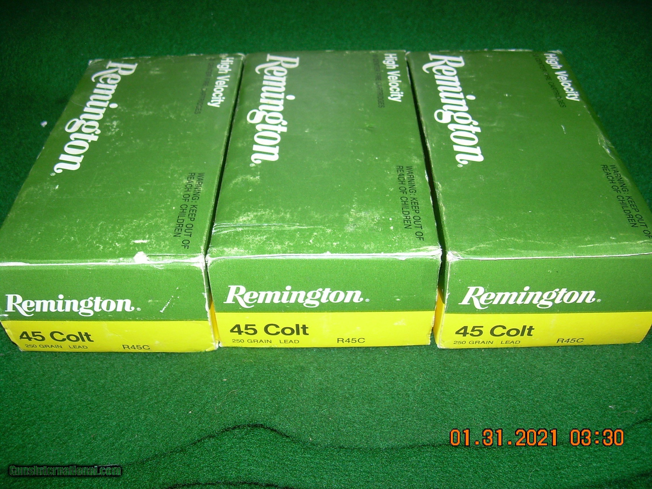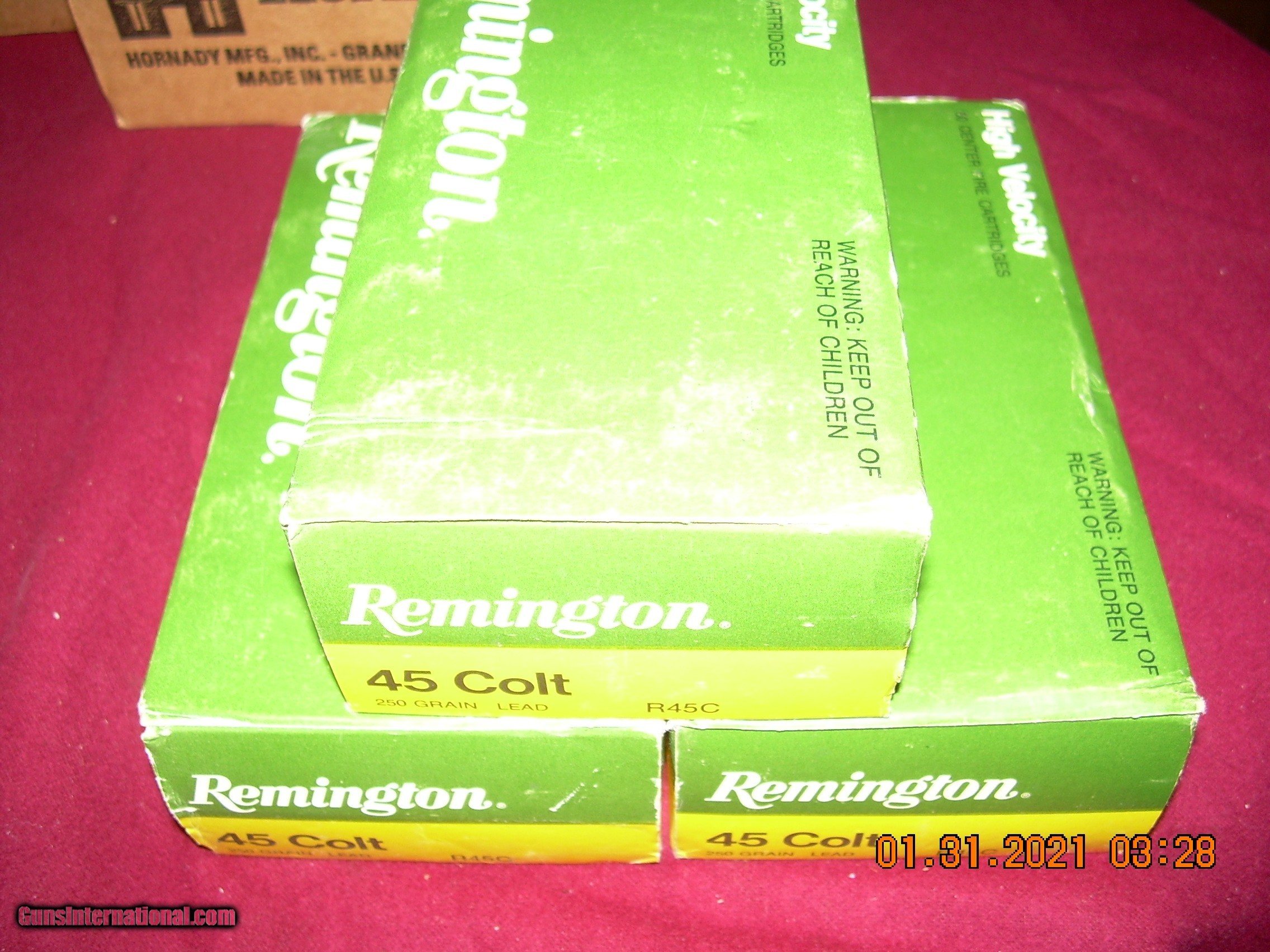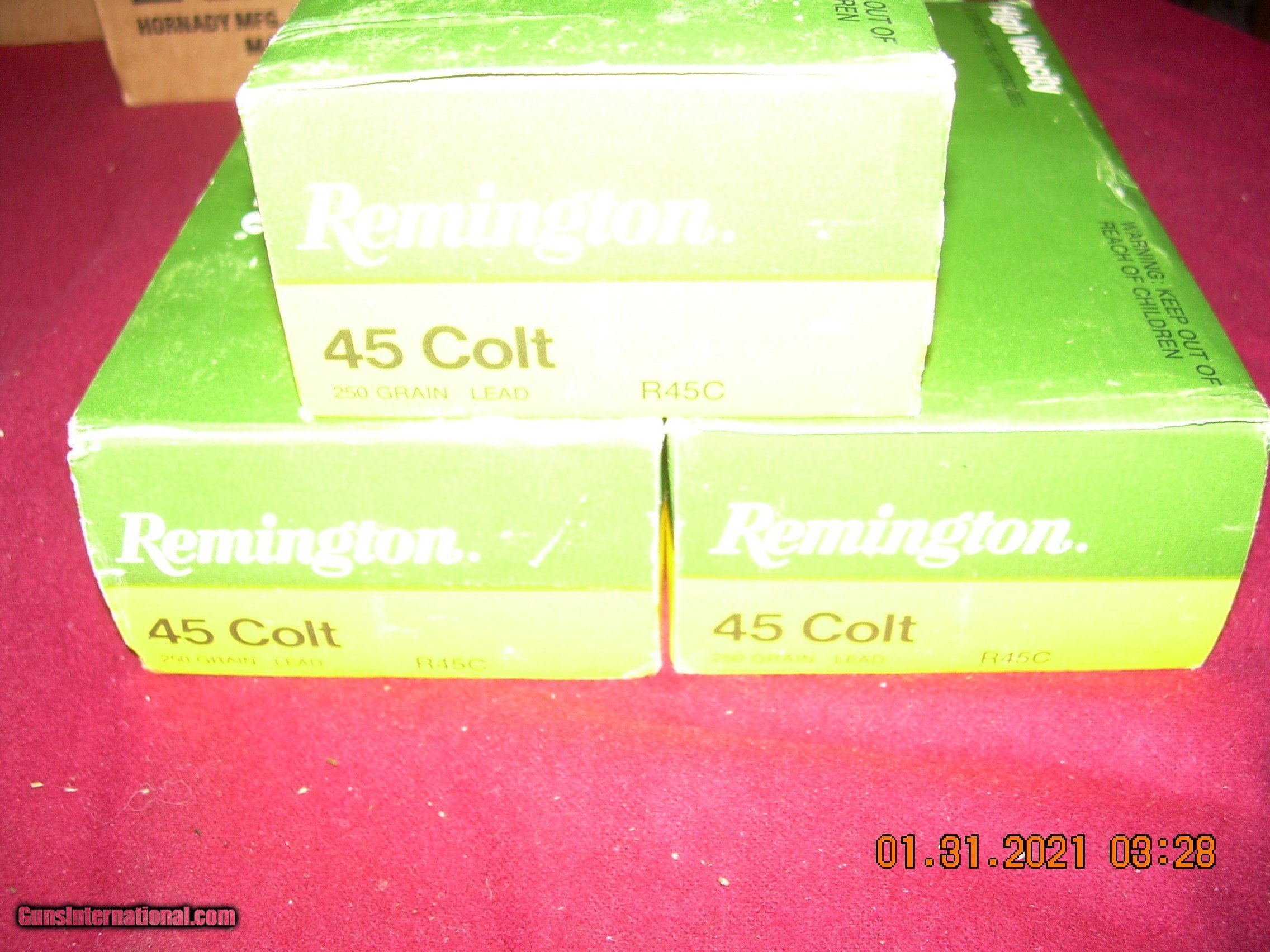 Description: Three full Remington manufactured factory 250gr lead boxes of 50. Bright and clean. 150 rounds total. Shipped to lower 48 for $225 SORRY- SOLD SOLD Handgun Caliber: .45 Colt |