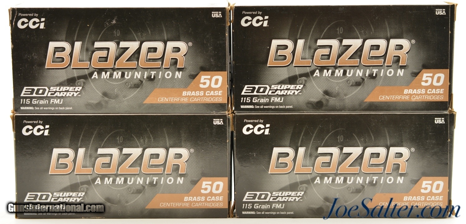 Description: This is 4 NOS full boxes of CCI Blazer 30 Super Carry 115 Grain FMJ ammunition. These are all brass cased rounds. 200 total.; SOLD |