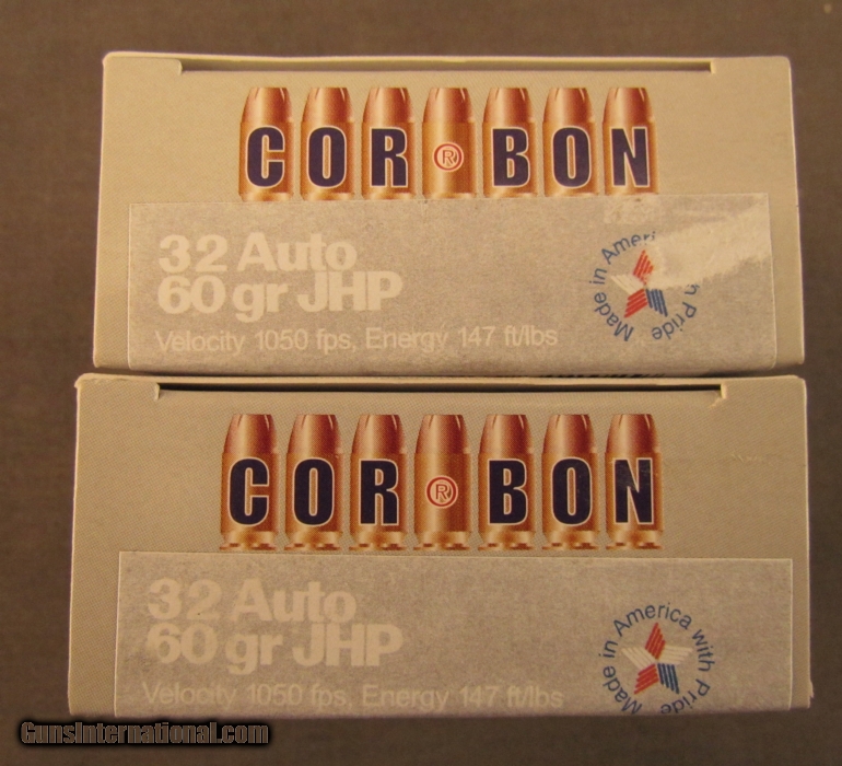 Description: Two full 20 round boxes (40 rounds total) of Cor-Bon 32 auto loaded with 60 grain jacketed hollow point bullets in brass cases with "Cor-Bon 32 auto " headstamp. Boxes are clean, one has a small label pull, ammo is bright and clean. This is considered super high quality self defense ammo by most knowlegable handgunners. SOLD Manufacturer: Cor-Bon Model: Ammo Caliber Info: .32 ACP Gauge Info: .32 ACP |
