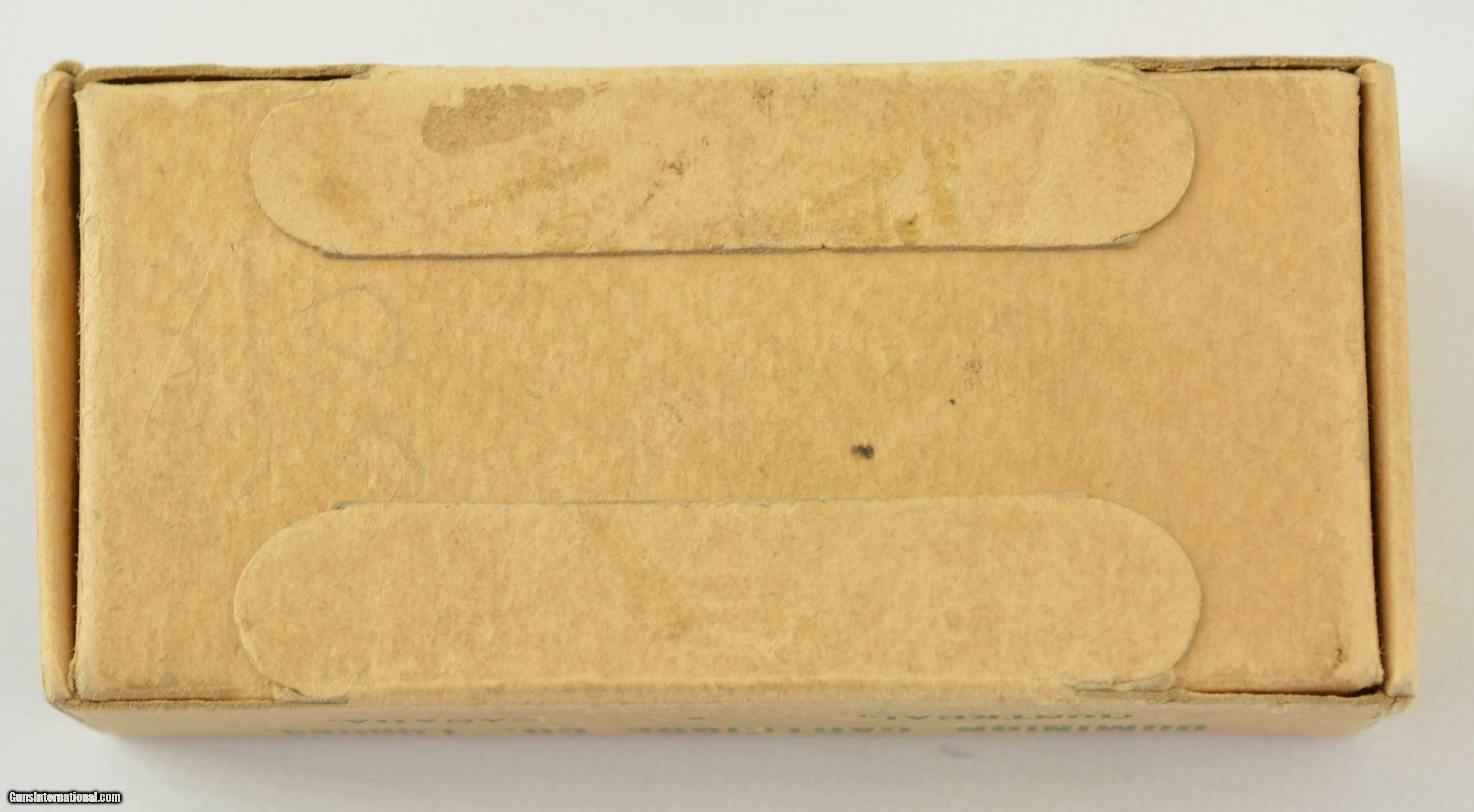 Description: Scarce Dominion sealed Box of 32 S&W cartridges . This is a very early circa 1900 box. This box rates as excellent plus condition. The top show all of the original green printing with the beaver trade mark and an open Smith & Wesson Baby Russian revolver. The better shows the original sealed flaps one find shows the company guarantee, the other end shows the cartridge designation. There is only a hint of a minor stain on the top left edge and on grade box fro the cartridge or S&W collector. The box is one of the Dominion paper box company boxes. Patented marked on the inside with the 1900 date and built with the two glued flaps used 1900 to 1905. SOLD Manufacturer: Dominion Model: Ammo Caliber Info: .32 S&W Gauge Info: .32 S&W |