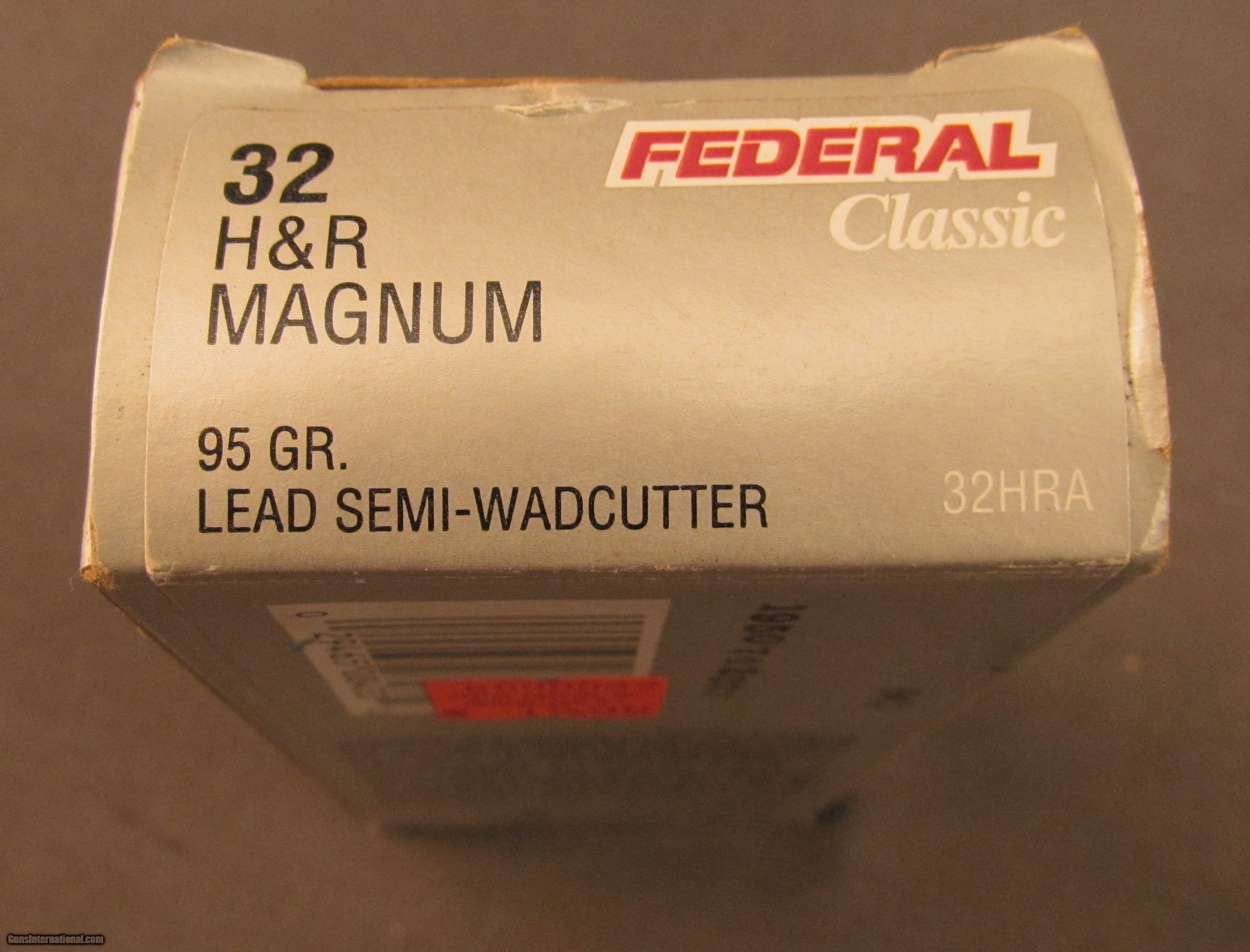 Description: This full 50 round box of 32 H+R mag is loaded with 95 grain lead semi wad-cutter bullets. Box shows shelf wear, ammo is mostly bright and clean with a few rounds showing light tarnish. SOLD Manufacturer: Federal Model: Ammo Caliber Info: .32 H+R Mag Gauge Info: .32 H+R Mag |
