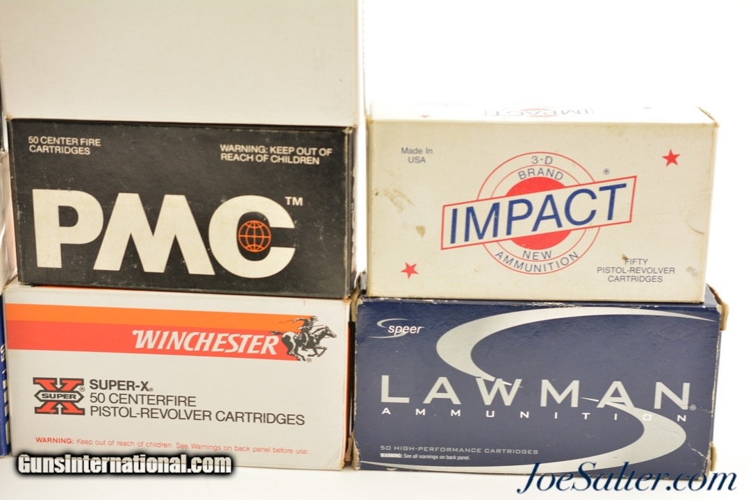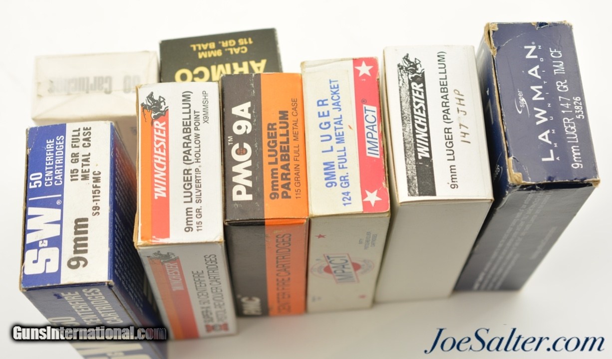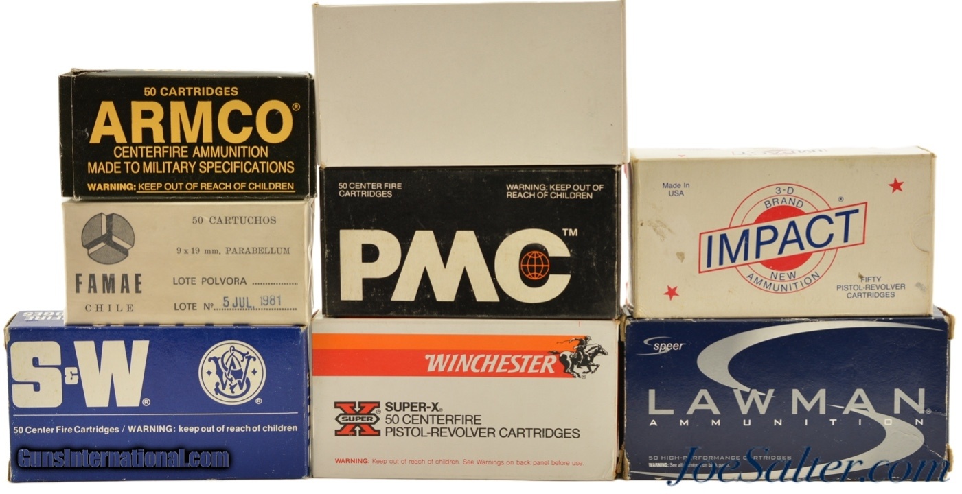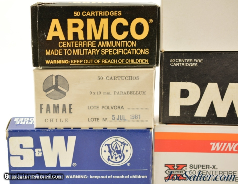 Description: This is a lot 9mm Luger Ammunition consisting of 1 box of vintage Famae Chile, excellent box made in 1981, 1 box of vintage PMC 9A 115gr. FMJ, 1 box of vintage Impact 124gr. FMJ, 1 box of Winchester 115gr. Silvertip HP, 1 vintage box of S&W 115gr. FMJ, 1 box of Winchester 147gr. JHP could be repack or reloads, 1 box of Lawman 147gr. TMJ CF and 1 box of Armsco 115gr. Ball. SOLD |