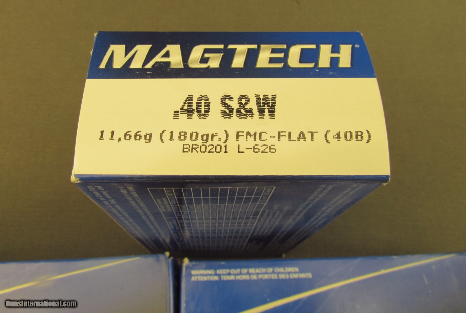 Description: Three full 50 round boxes (150 rounds total) of mag tech 40 S+W 180 grain full metal case flat point ammo. This is "BROZ01 L-626" coded on end flaps. Boxes show very little shelf wear, ammo is bright and clean. SOLD Manufacturer: Magtech Model: Ammo Caliber Info: .40 S&W Gauge Info: .40 S&W |