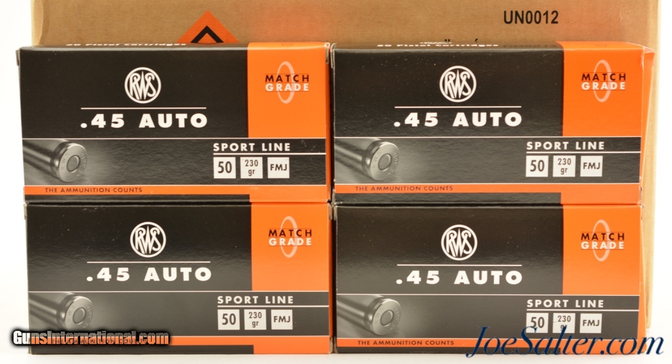 Description: 4 Boxes of New Old Stock Ammo by RWS. Sport Line 230 grain FMJ 45 Auto. 200 Rounds total.; SOLD |