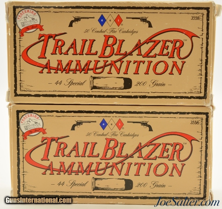 Description: This is two NOS full boxes of 50, Speer Trail Blazer 44 SPL 200gr. FLN cowboy action shooters loads. These are nonrelaodable and made with high grade Speer components. Cases are aircraft grade aluminum.; SOLD |