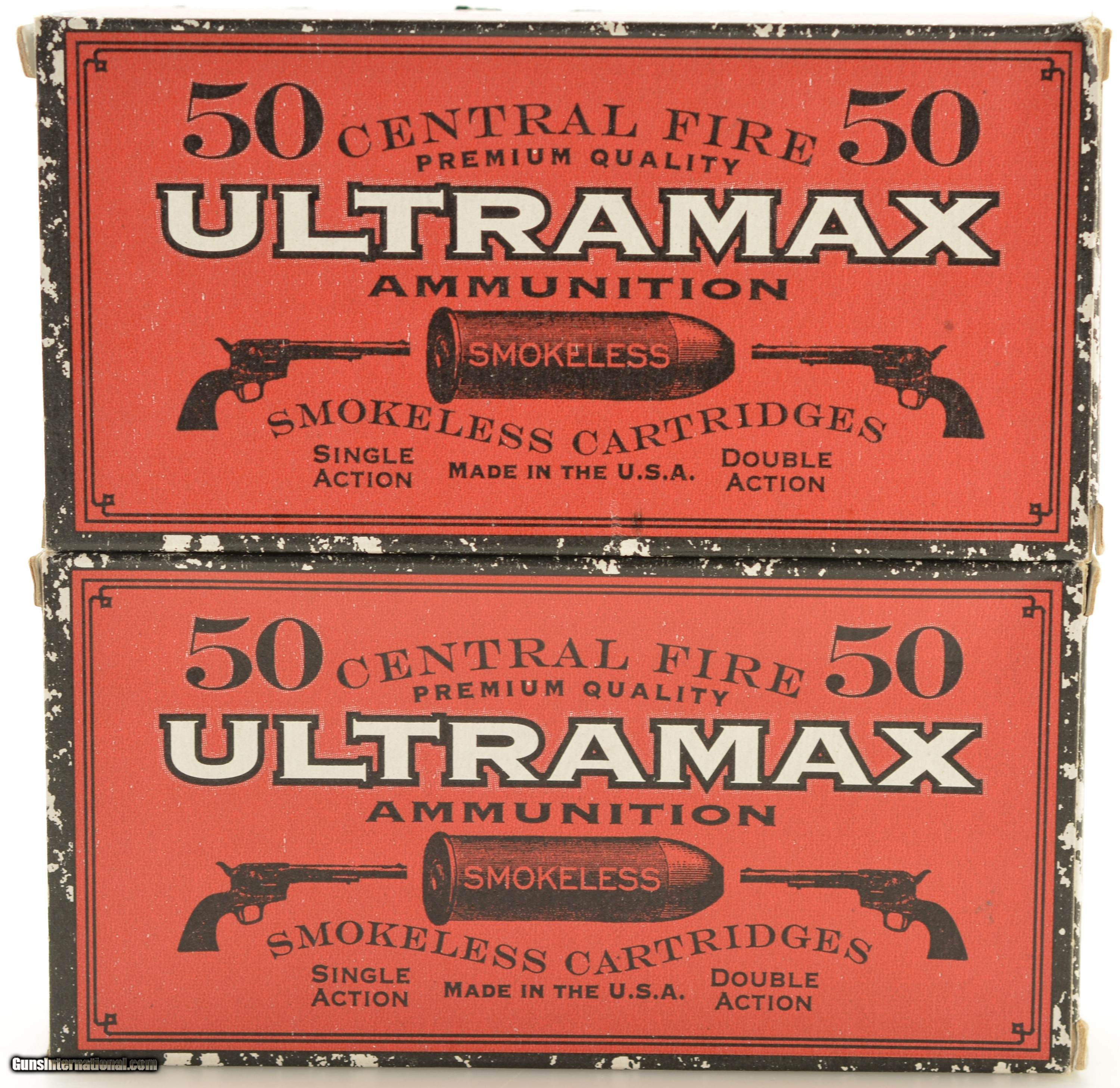 Description: This is a lot of two full boxes, 100 original rounds, of .44 Special ammunition manufactured by Ultramax with 200 grain round nose, flat point bullets. The boxes and cartridges are in excellent, as new, condition. SOLD Manufacturer: Ultramax Model: Ammo Caliber Info: .44 Special Gauge Info: .44 Special |