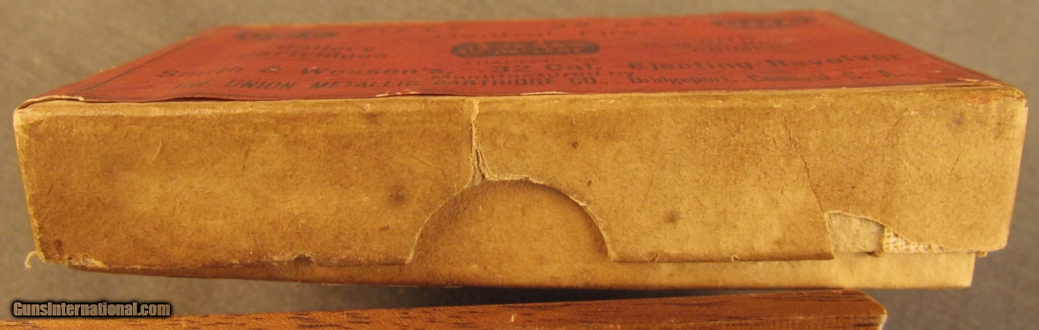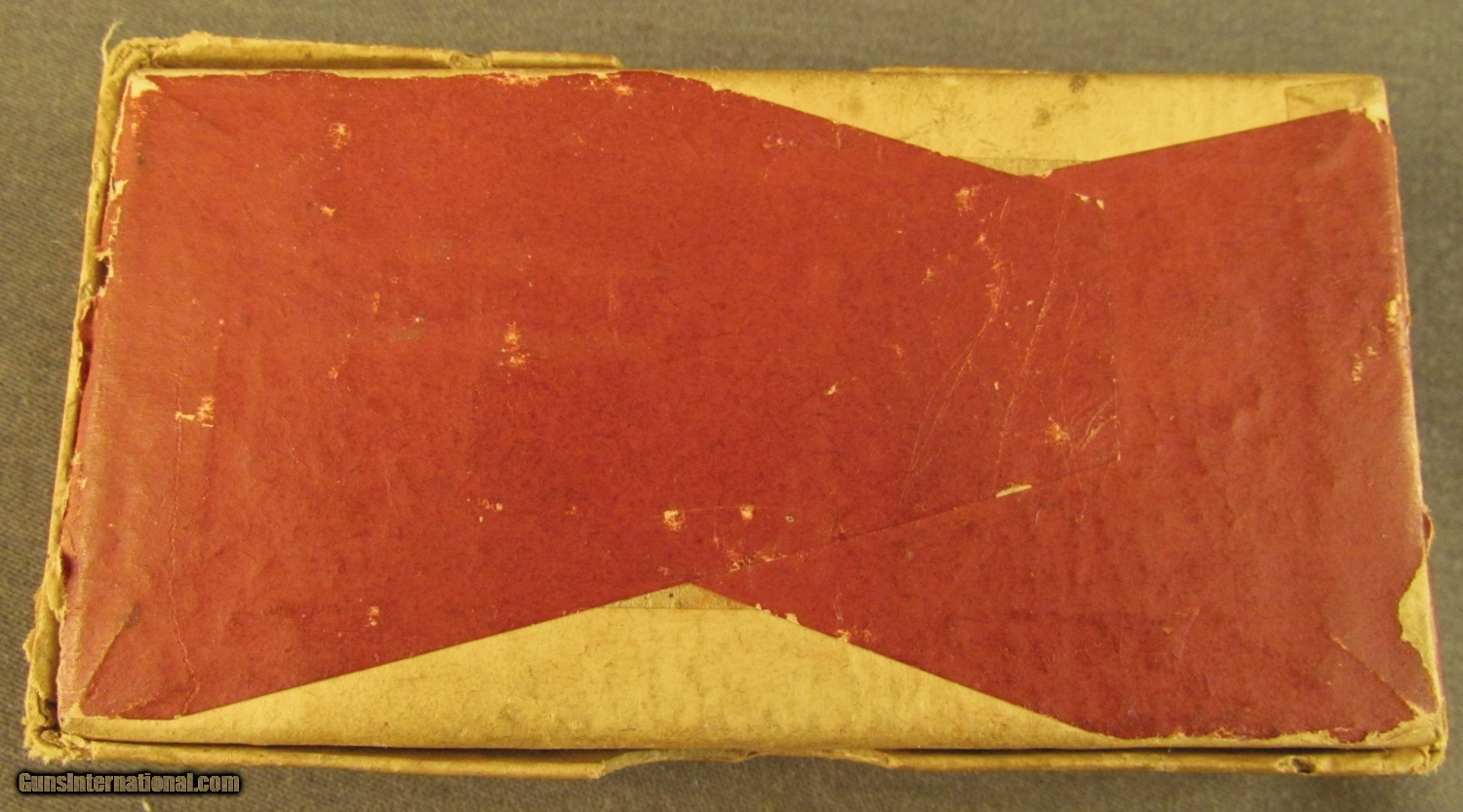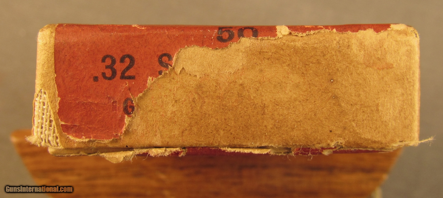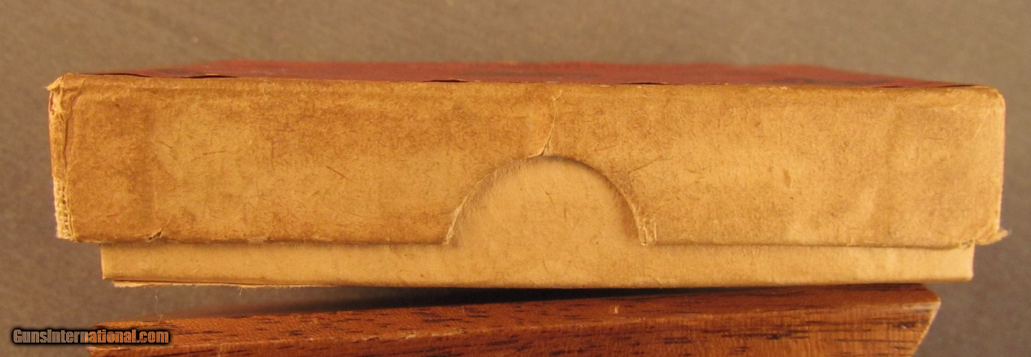 Description: This partial (33 rounds) two piece full top box remains in excellent condition with clean bright label showing a couple tiny scuffs. Part of left side label is missing. Box contains brass cases with copper primers headstamped "U.M.C. 32 S&W" with flush seated wadcutter bullets. Ammo shows light discoloration and oxidation. This box dates from around 1890, it would look great displayed with a period revolver. A fairly scarce UMC Gallery Box. SOLD Manufacturer: UMC Model: Ammo Caliber Info: .32 S&W Gauge Info: .32 S&W |