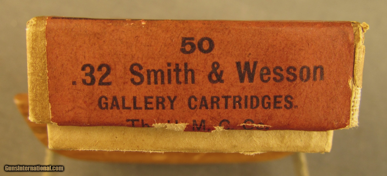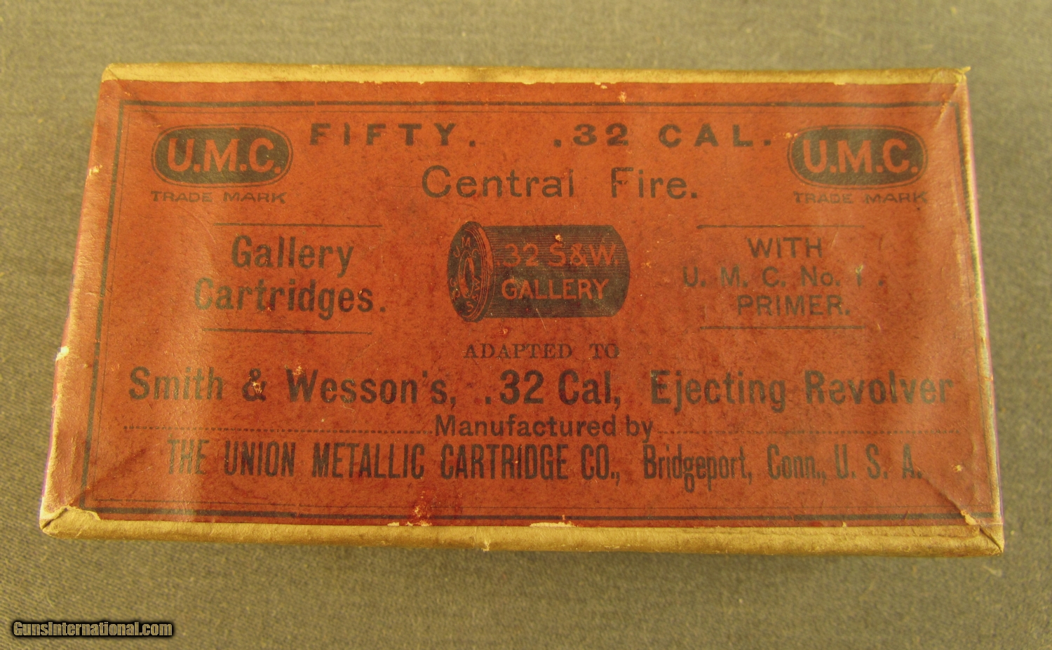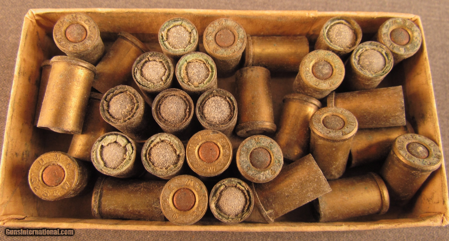 Description: This partial (33 rounds) two piece full top box remains in excellent condition with clean bright label showing a couple tiny scuffs. Part of left side label is missing. Box contains brass cases with copper primers headstamped "U.M.C. 32 S&W" with flush seated wadcutter bullets. Ammo shows light discoloration and oxidation. This box dates from around 1890, it would look great displayed with a period revolver. A fairly scarce UMC Gallery Box. SOLD Manufacturer: UMC Model: Ammo Caliber Info: .32 S&W Gauge Info: .32 S&W |