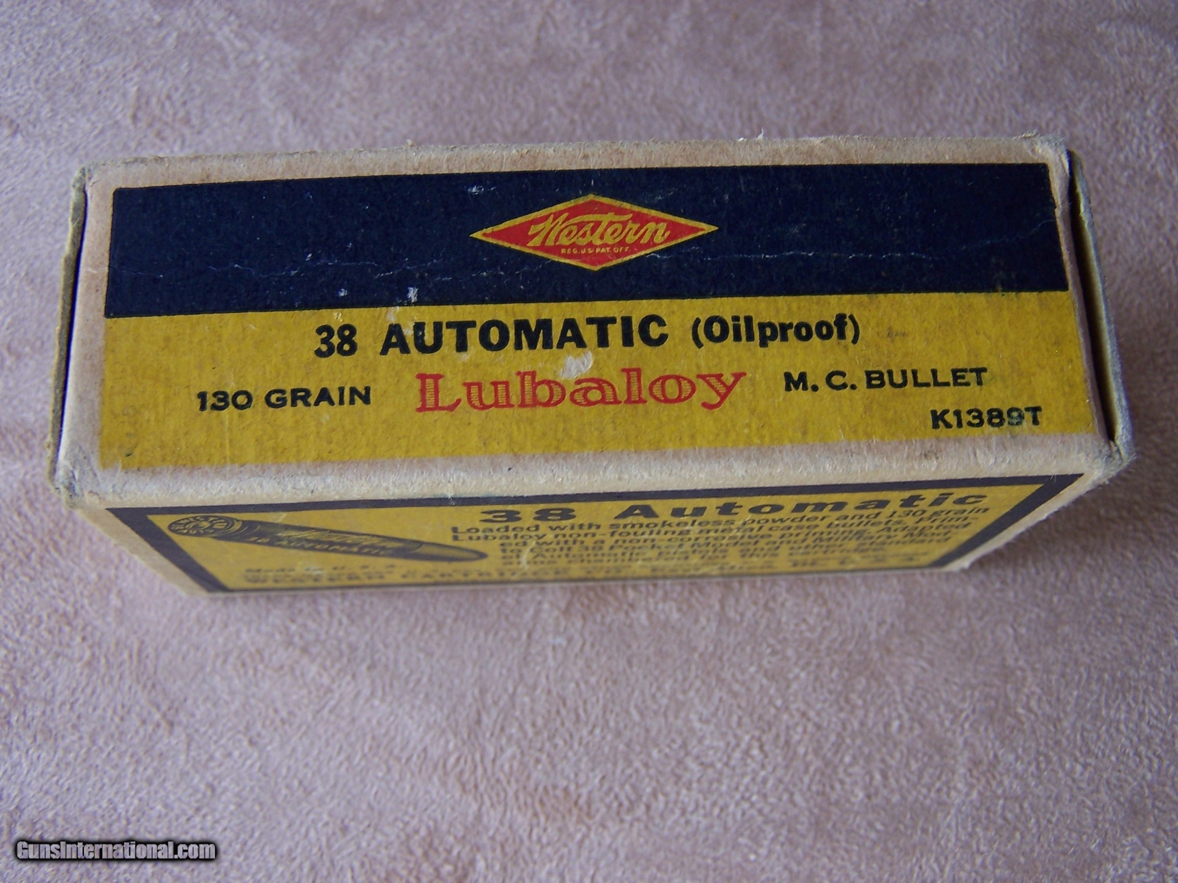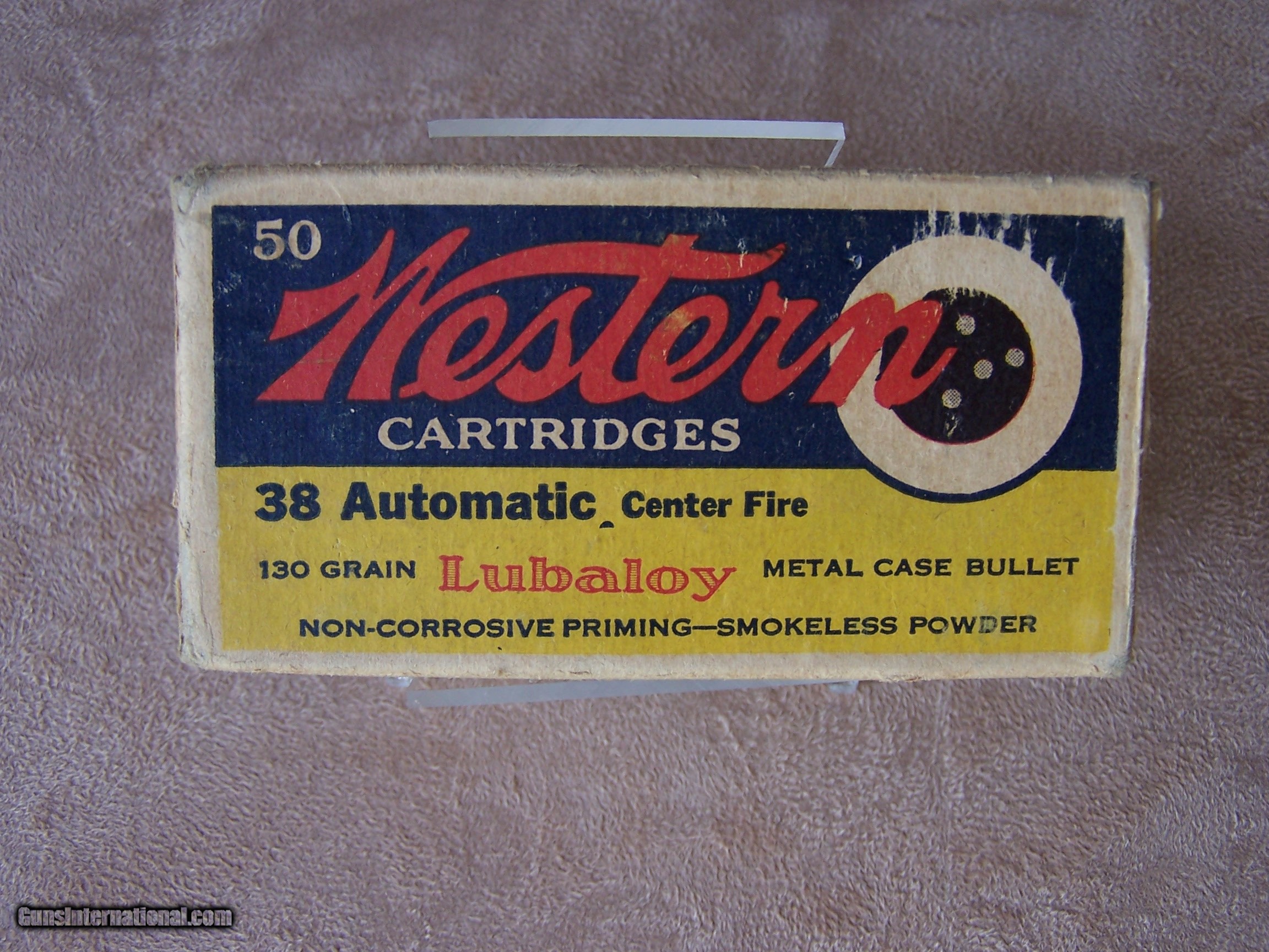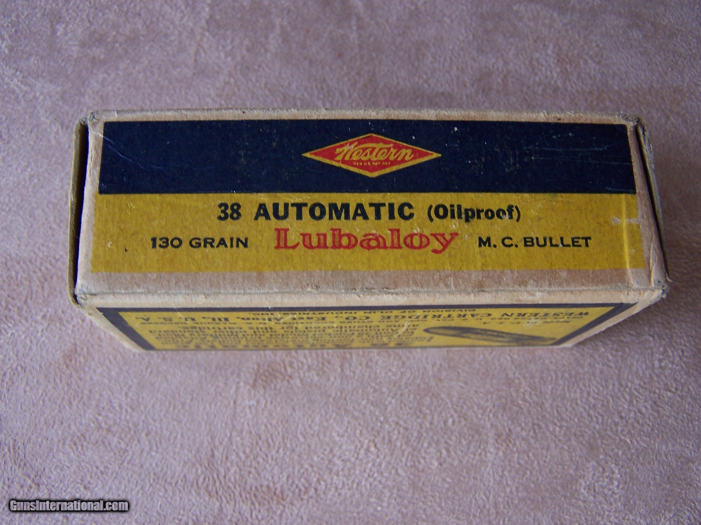 Description: An excellent box of Western .38 Automatic Lubaloy 130 GR. ammo. Non-corrosive priming smokeless power. 50 cartridges. A wonderful box of collector ammo to go with your auto pistol. Please see my other boxes of collector ammo as well as the various collectible guns that I have listed. Price is $100.00 plus $12 shipping. SOLD |