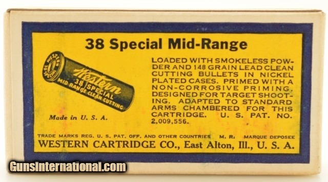 Description: This is a scarce full box (50 rounds), fresh out of a brick of 5 boxes, of .38 Special Mid-Range ammunition manufactured by Western in the iconic yellow blue and red "bullseye" box. The box is in excellent condition with normal rub and storage marks common to these blue and yellow solid ink coverage boxes. It is full with original, as new, excellent cartridges. A scarce box that is in excellent condition. SOLD |