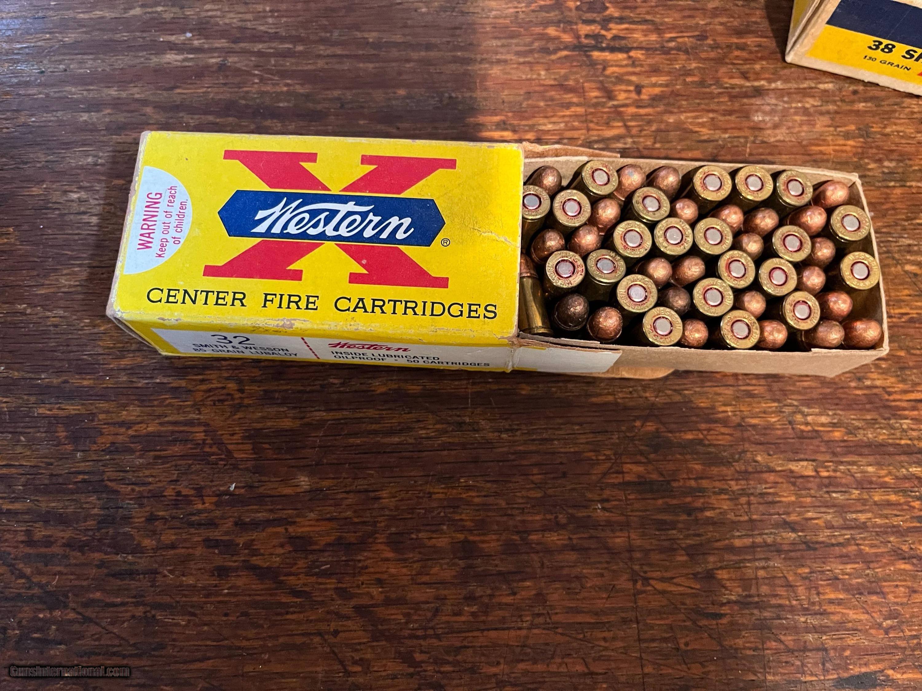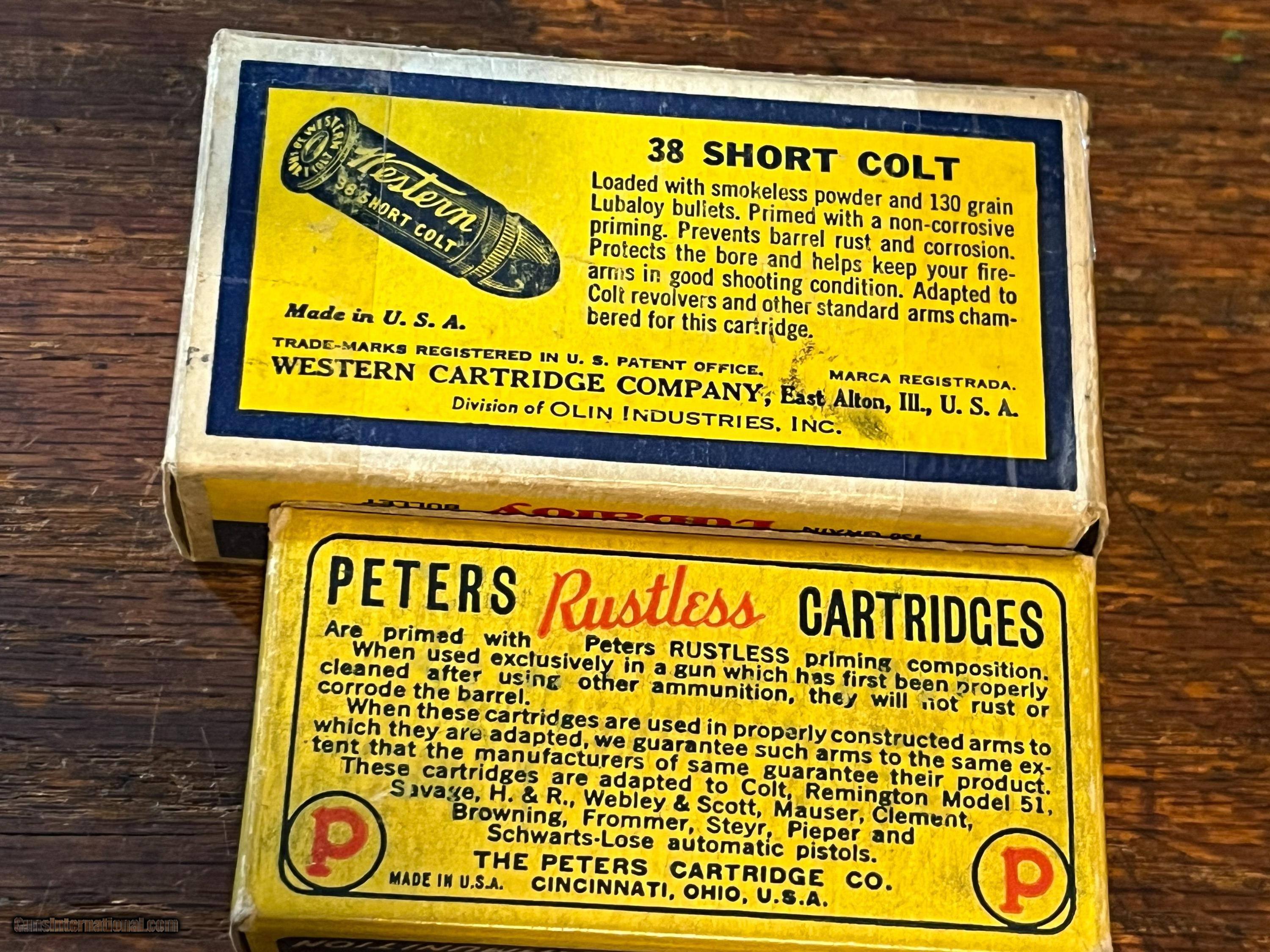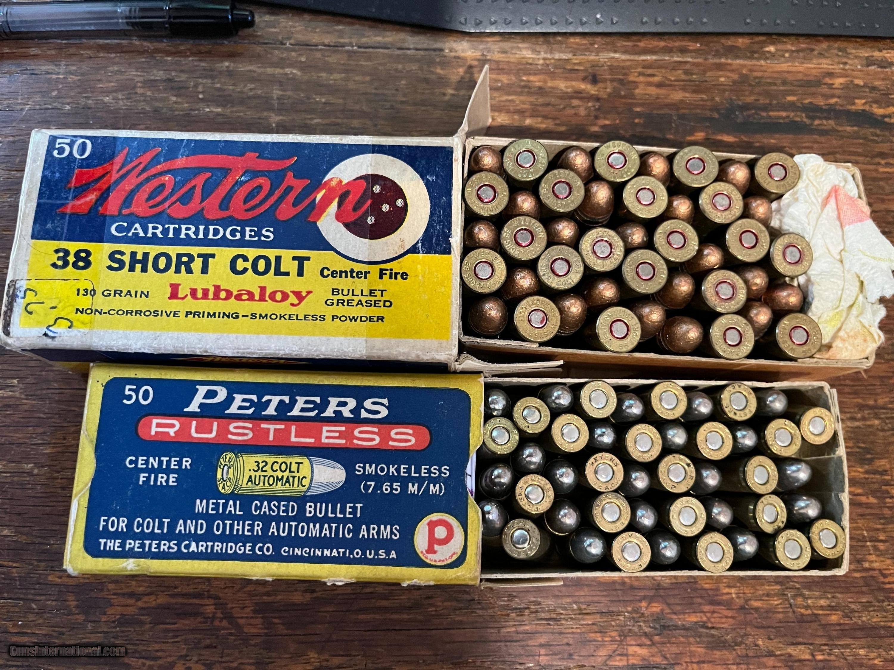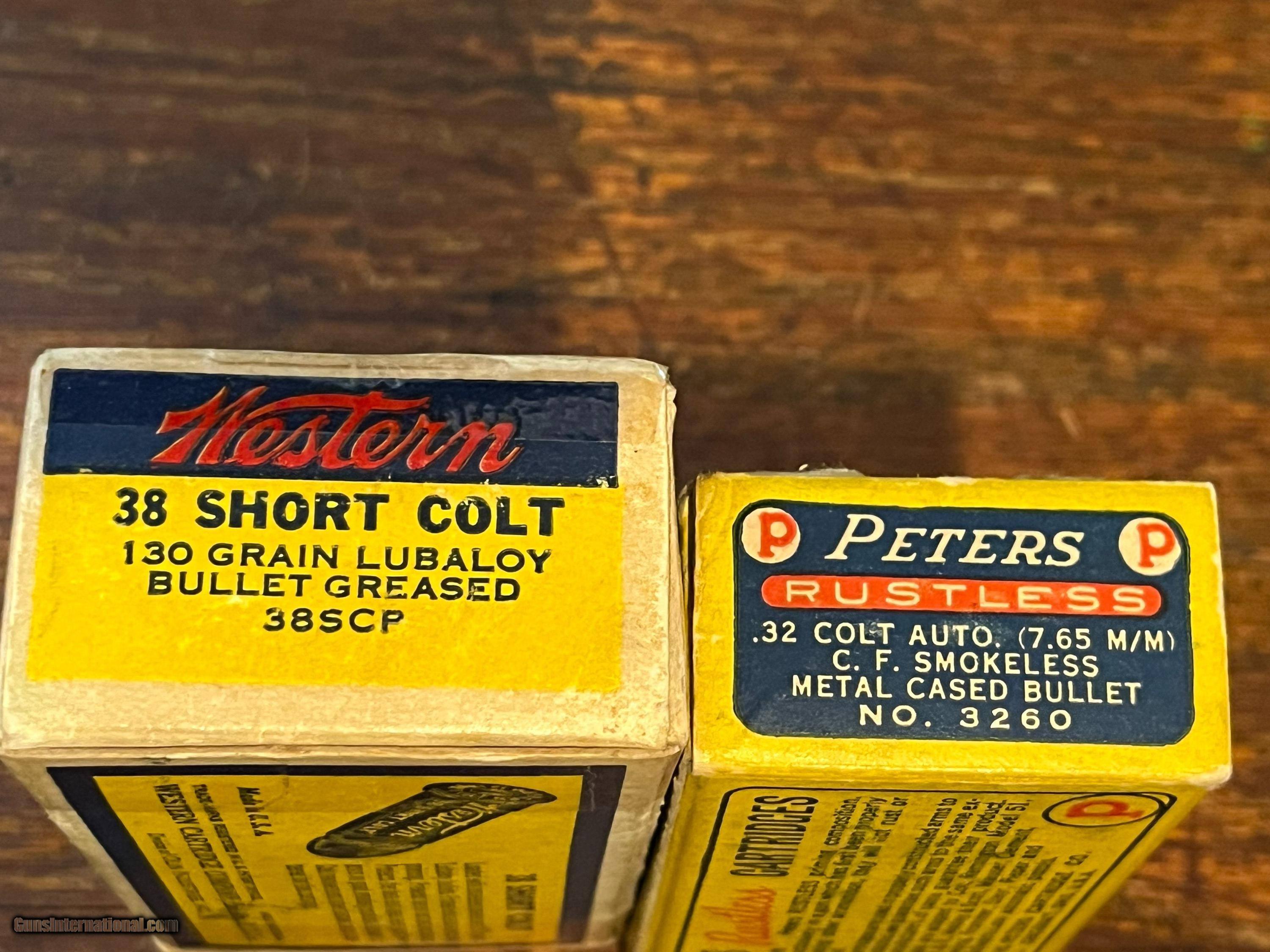 Description: 1. Box Western 38 Short Colt 40 rds. 2. Box Western 32 S&W 40 rds. 3. Box Peters 32 Auto 40 rds. SOLD Handgun Caliber: .32 ACP (7.65x17mm Browning SR), .32 S&W, .38 Short Colt |