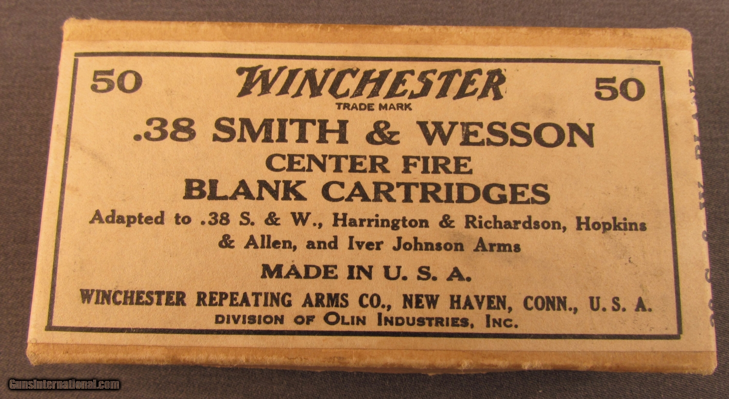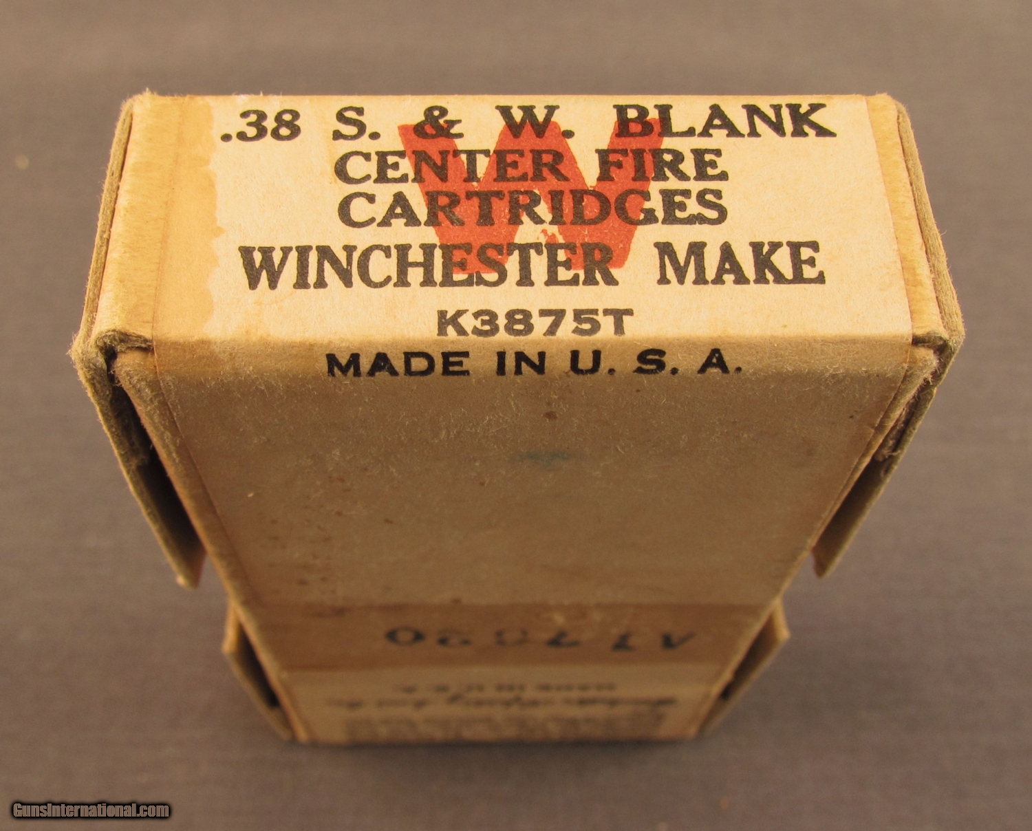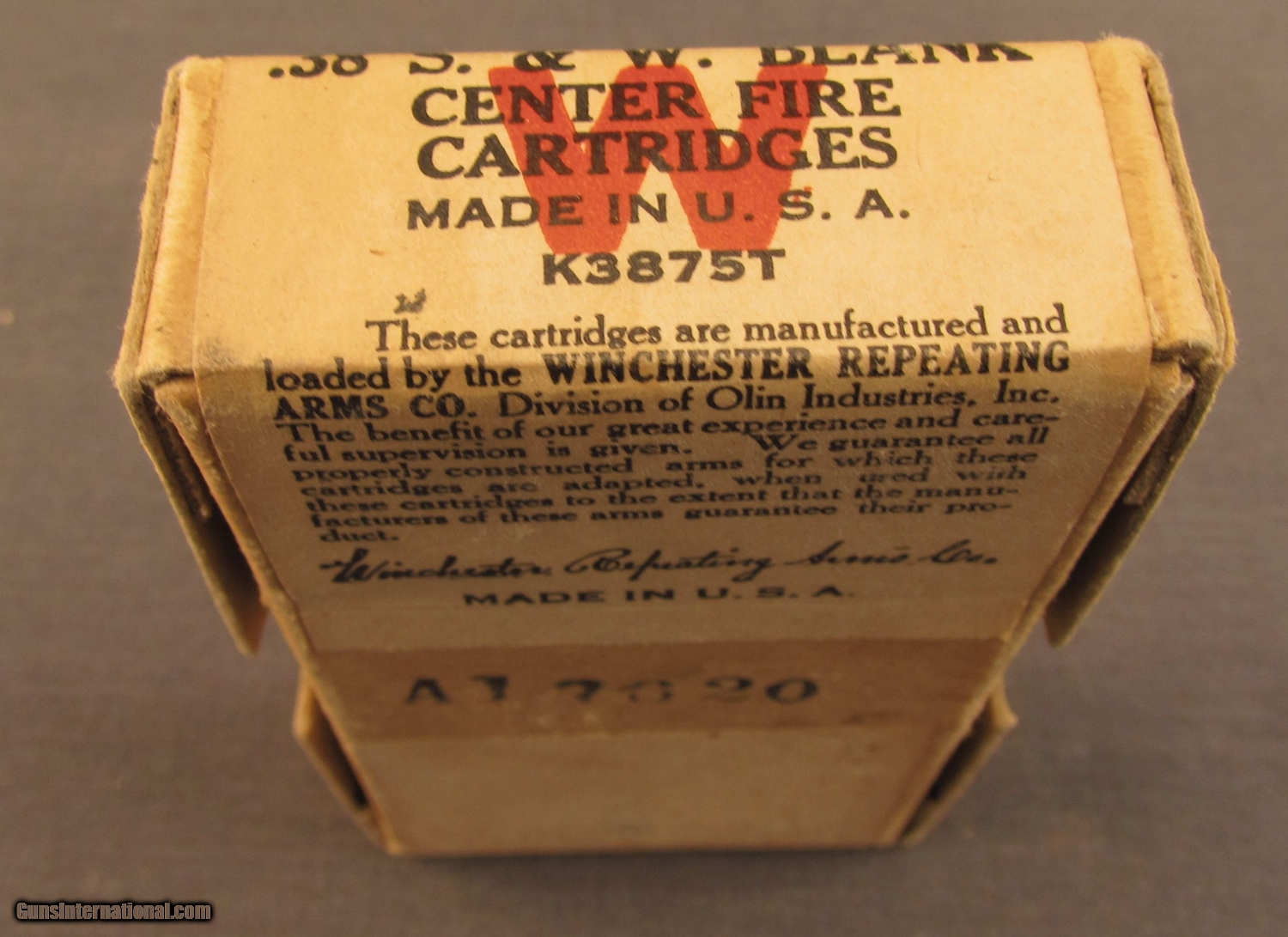 Description: This full sealed 50 round box remains in excellent condition with very light soiling and almost no shelf wear. label has a callout for S&W, Harrington & Richardson, Hopkins & Allen, and Iver Johnson Arms. Label also has an Olin Industries callout, so this box can be dated to 1945-56 period. SOLD Manufacturer: Winchester Model: Ammo Caliber Info: .38 S&W Gauge Info: .38 S&W |