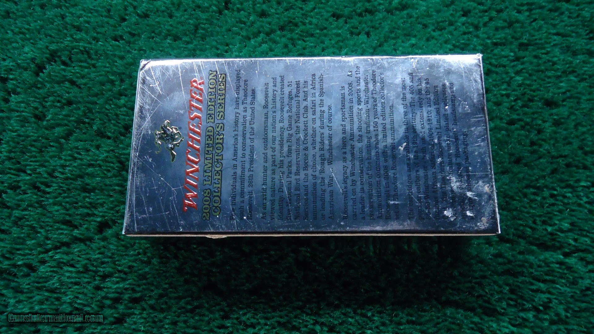 Description: Full box of Winchester 45 Long Colt Teddy Roosevelt Limited Edition Collector Series 250 Grain Lead Round Nose Ammo. Roosevelt's legacy as a hero and sportsman is carried on by Winchester Ammunition in 2008. As a leader in conservation and the shooting sports as well as the preservation of the hunting tradition. Winchester Ammunition commemorates 150 years of Theodore Roosevelt in 2008 with a Limited Edition Collector's series of ammunition. The Theodore Roosevelt limited edition cartridges feature a nickel-plated shellcase with a specialty designed Roosevelt headstamp. They come in a collectible embossed package. Free Shipping. Leroy Merz Antique Firearms specializes in antique and vintage Winchesters and other fine American firearms. Since 1965 Mr. Merz has taken part in the world of firearms and has been a contributor to many well known reference books. We have hundreds of additional guns in every price range at our home online. Search for Merz Antiques in google. SOLD Handgun Caliber: .45 Colt |