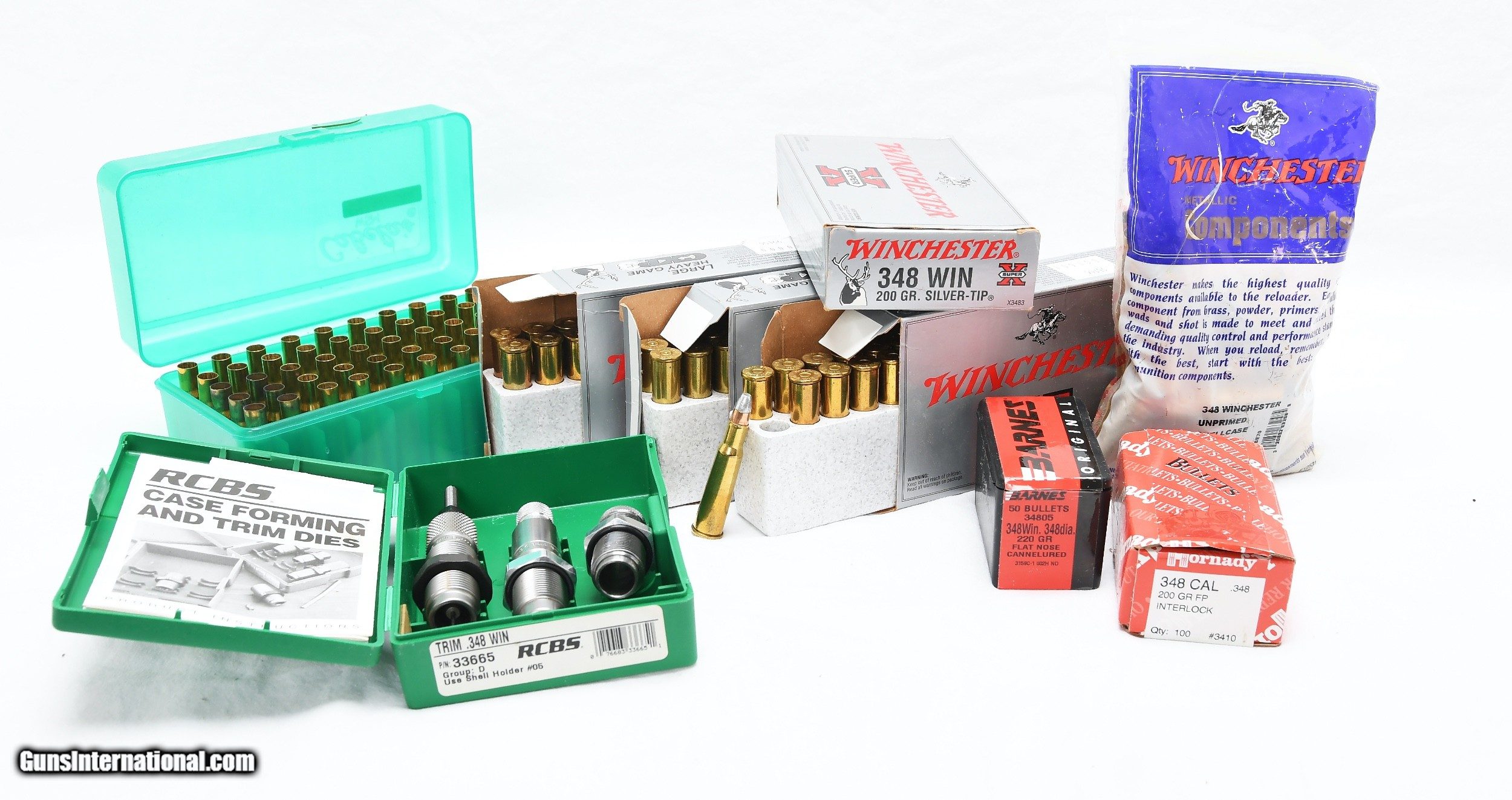 Description: SALE PENDING 1 RCBS "D" dies for .348 with shell holder 2 Full boxes of Winchester .348 200 grain silver tips 1 Box of 13 live and 7 fired Winchester .348 200 grain silver tips 1 Box of fired cases 1 Bag of Winchester new .348 brass 1 Box of 50 Barnes 220 grain flat nose cannelured bullets 1 Box of Hornady 200 grain flat point bullets 50 Rounds of Winchester brass..44 primed and 6 fired SOLD |