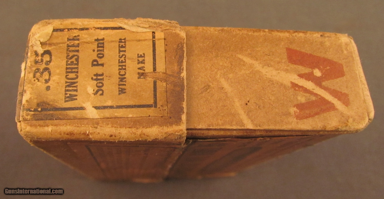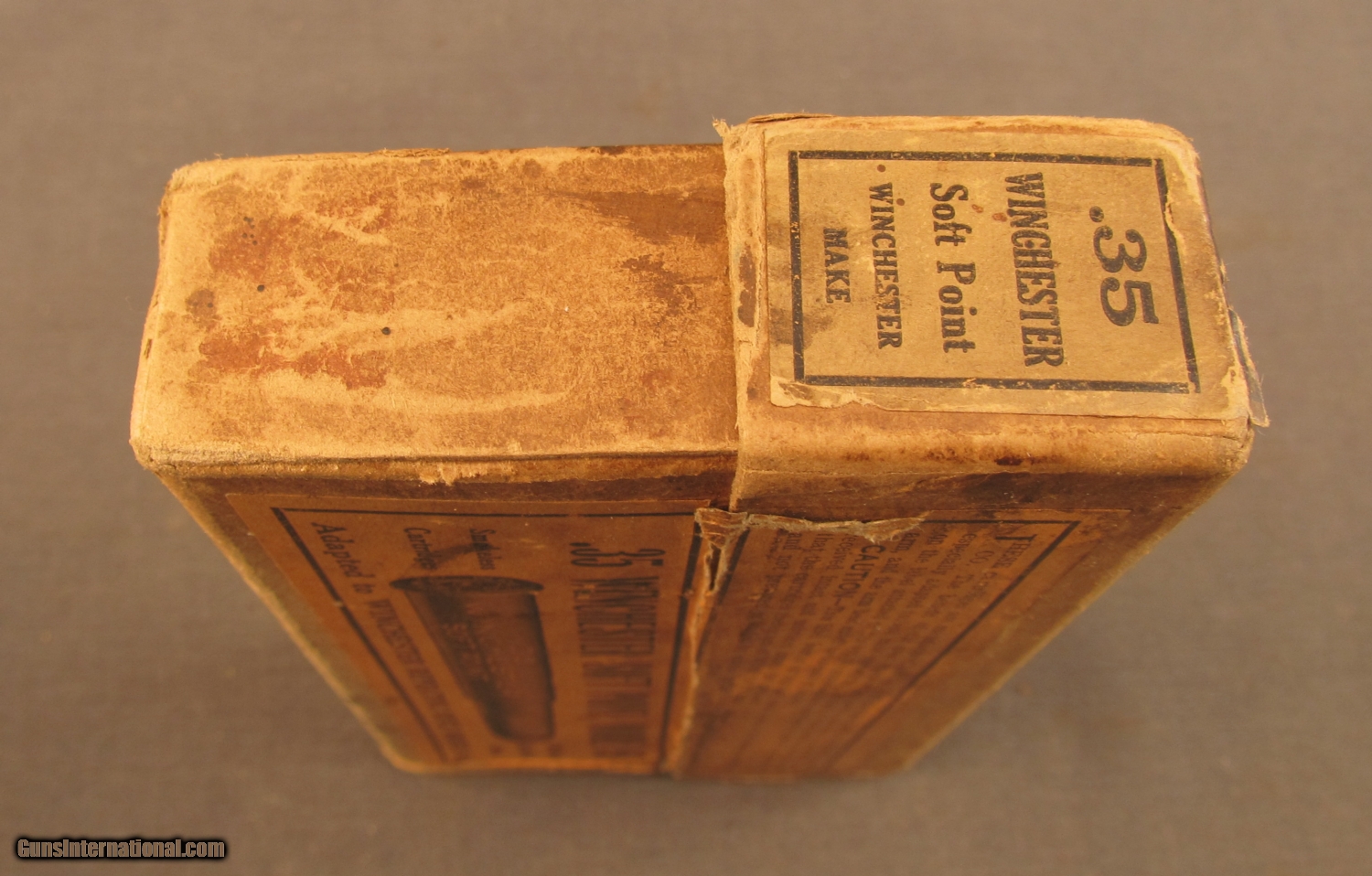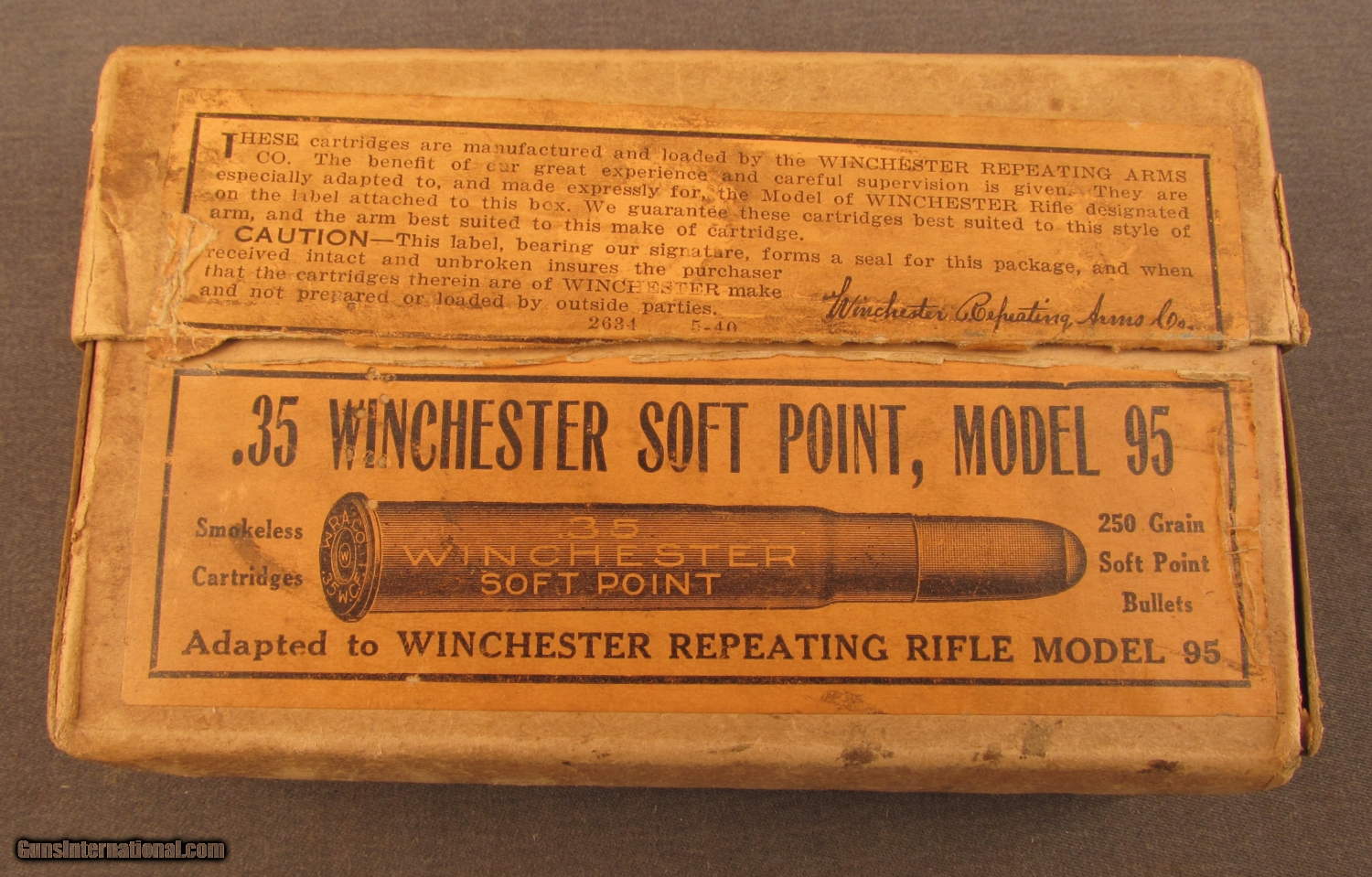 Description: This full open 20 round box is loaded with 250 grain soft point bullets in brass cases with "W.R.A. Co. 35 W.C.F." headstamps. Box shows soiling and minor shelf wear. Some careful cleaning may improve labels. Top label has a 10-21 date, side label shows 5-40, a very late date for this style of box. Front label has two model 95 callouts. SOLD Manufacturer: Winchester Model: Ammo Caliber Info: .35 WCF Gauge Info: .35 WCF |