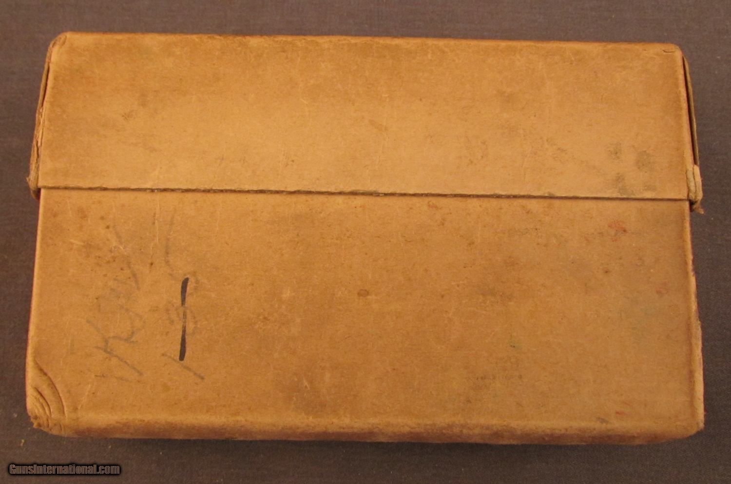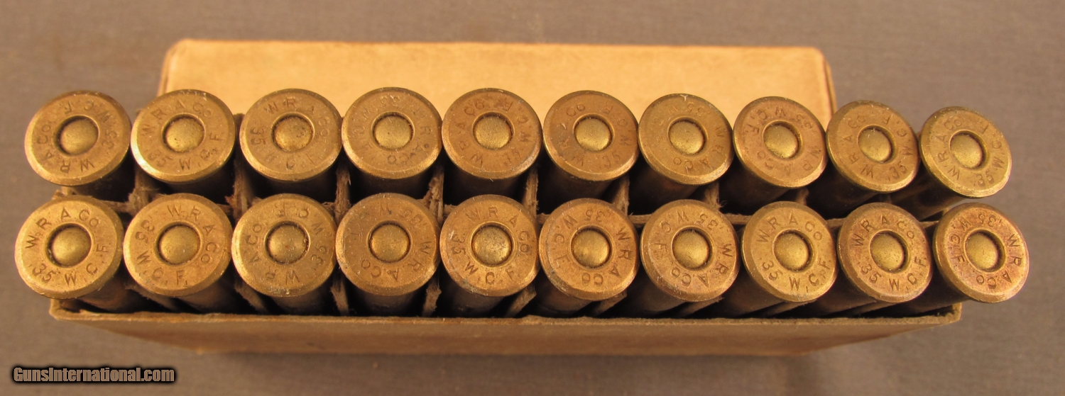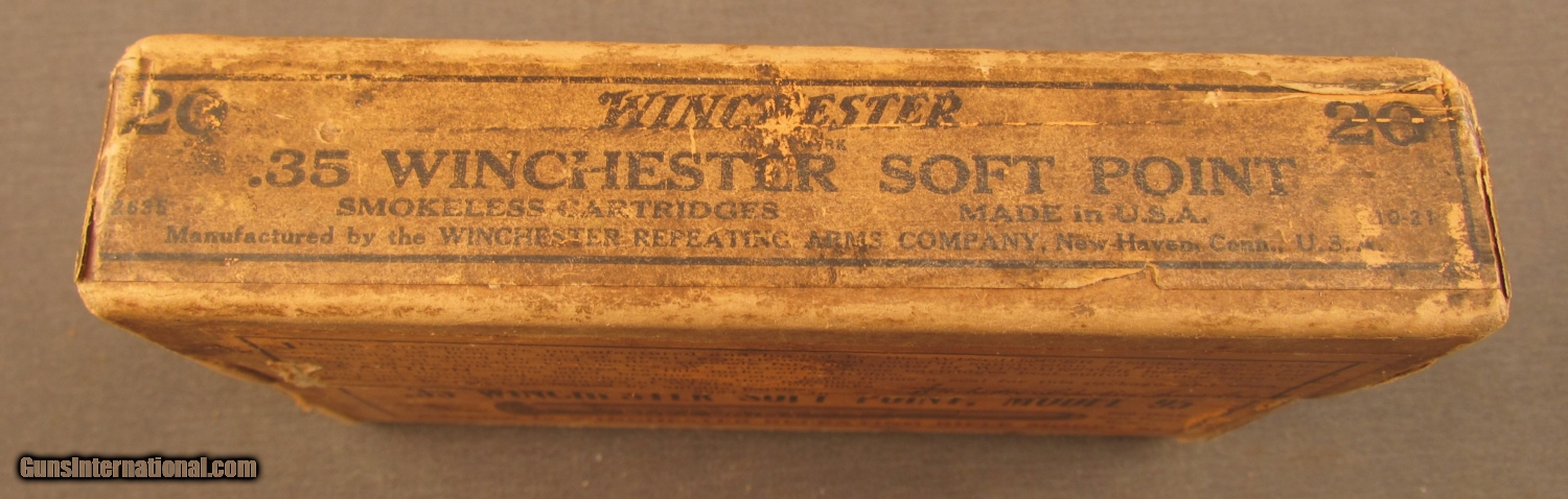 Description: This full open 20 round box is loaded with 250 grain soft point bullets in brass cases with "W.R.A. Co. 35 W.C.F." headstamps. Box shows soiling and minor shelf wear. Some careful cleaning may improve labels. Top label has a 10-21 date, side label shows 5-40, a very late date for this style of box. Front label has two model 95 callouts. SOLD Manufacturer: Winchester Model: Ammo Caliber Info: .35 WCF Gauge Info: .35 WCF |