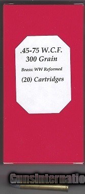 Description: .45-75 W.C.F. Cartridges Manufactured by Buffalo Arms. Formed and resized from original Winchester/Western .45-70 brass. The bullet is 300 Grain. The cartridges are in very good (++) condition. Buyer pays actual shipping charges. Multiple items are combined for reduced shipping. Please do not hesitate to contact us if you should have any questions. SOLD Rifle Caliber: .45-75 Winchester |