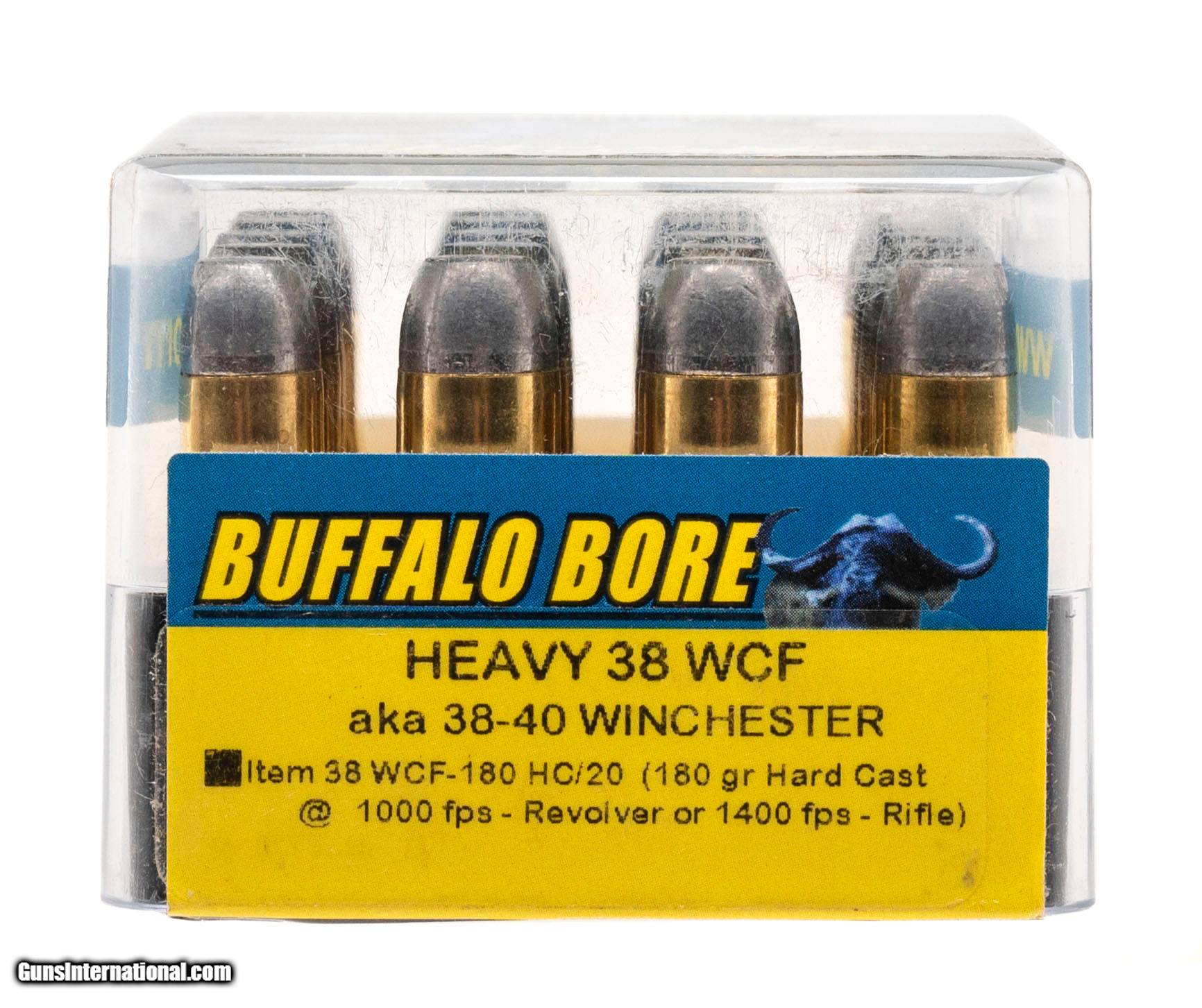 Description: "Buffalo Bore Heavy 38 WCF a.k.a 38-40 Winchester 180 Grain Hard Cast Ammo. 1000 FPS for Revolver or 1400 FPS for Rifle. One box of 20 Hard Cast Rounds. SOLD |
