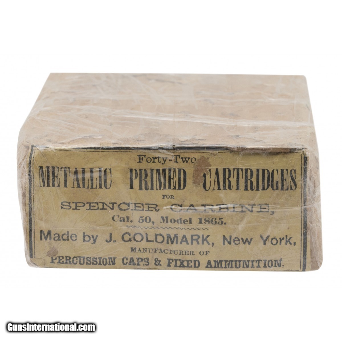 Description: ".50Cal Spencer Carbine Primed Cartridges by J.Goldmark, New York. Unopened Box of 42. SOLD |