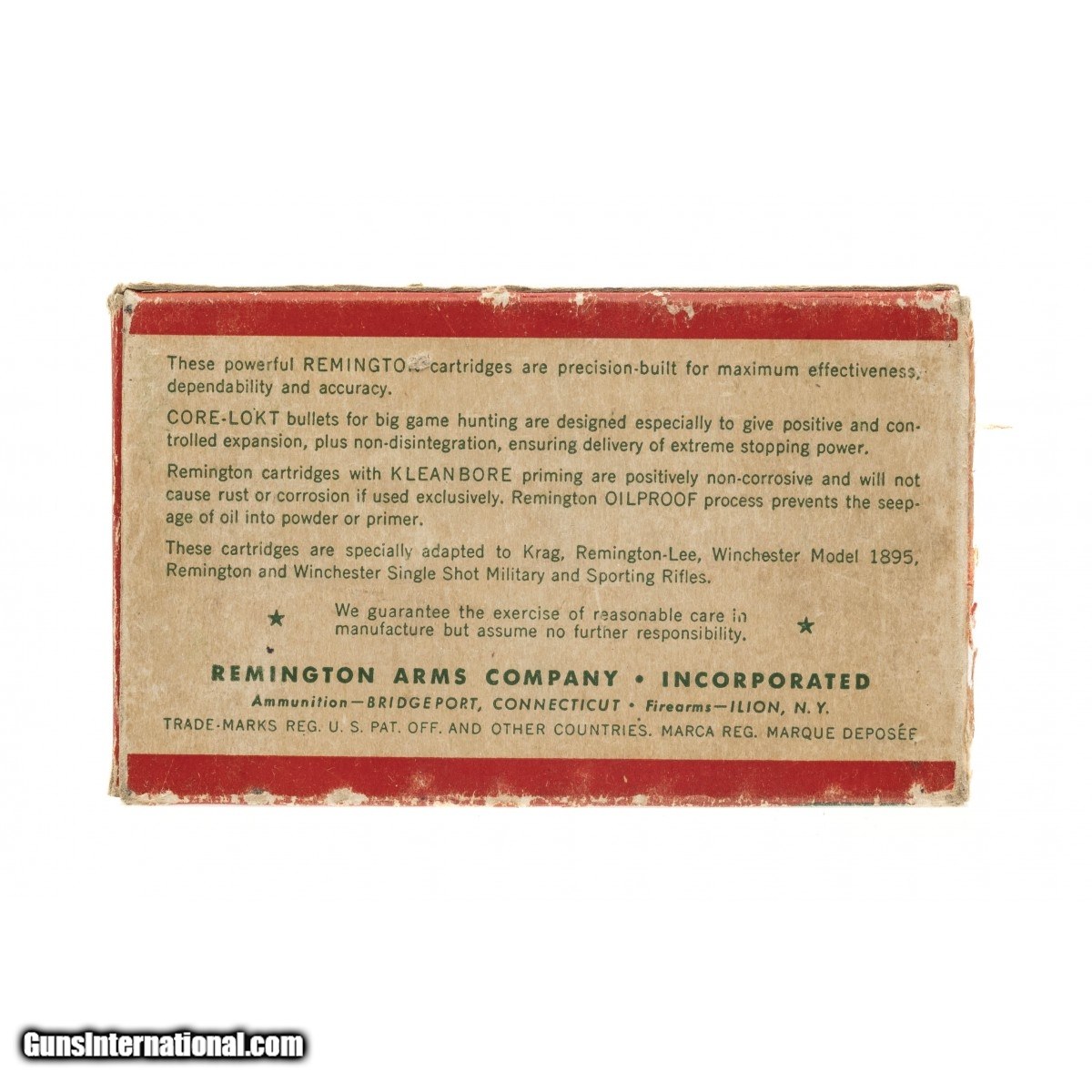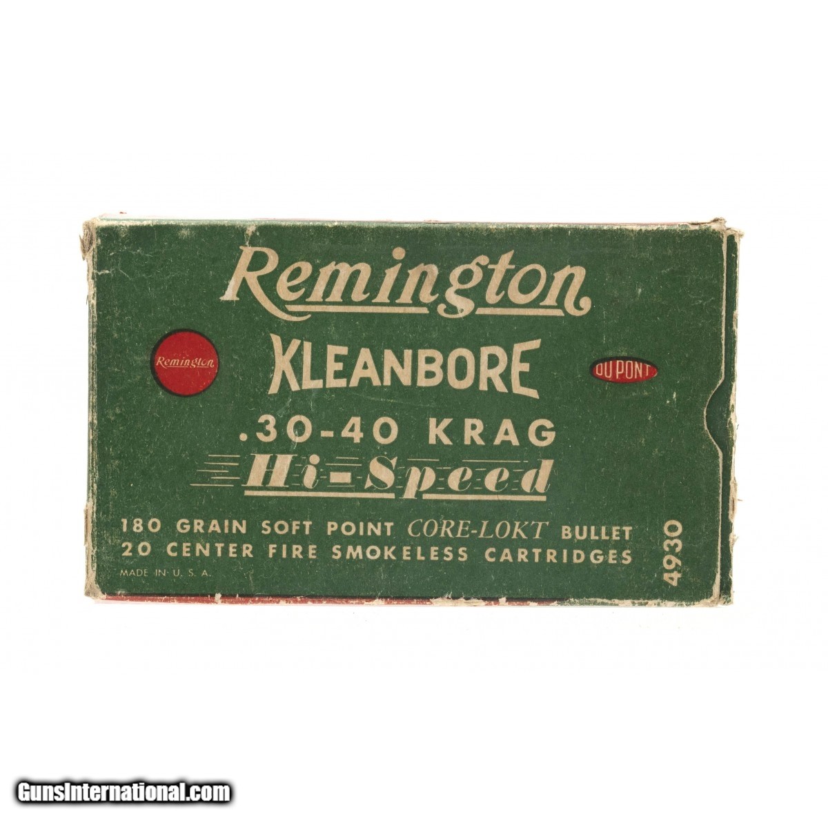 Description: " 20rd box of Remington Kleanbore .30-40 Krag 180 grain soft point core lokt. Box shows some storage wear with some discoloration along the edges. SOLD |