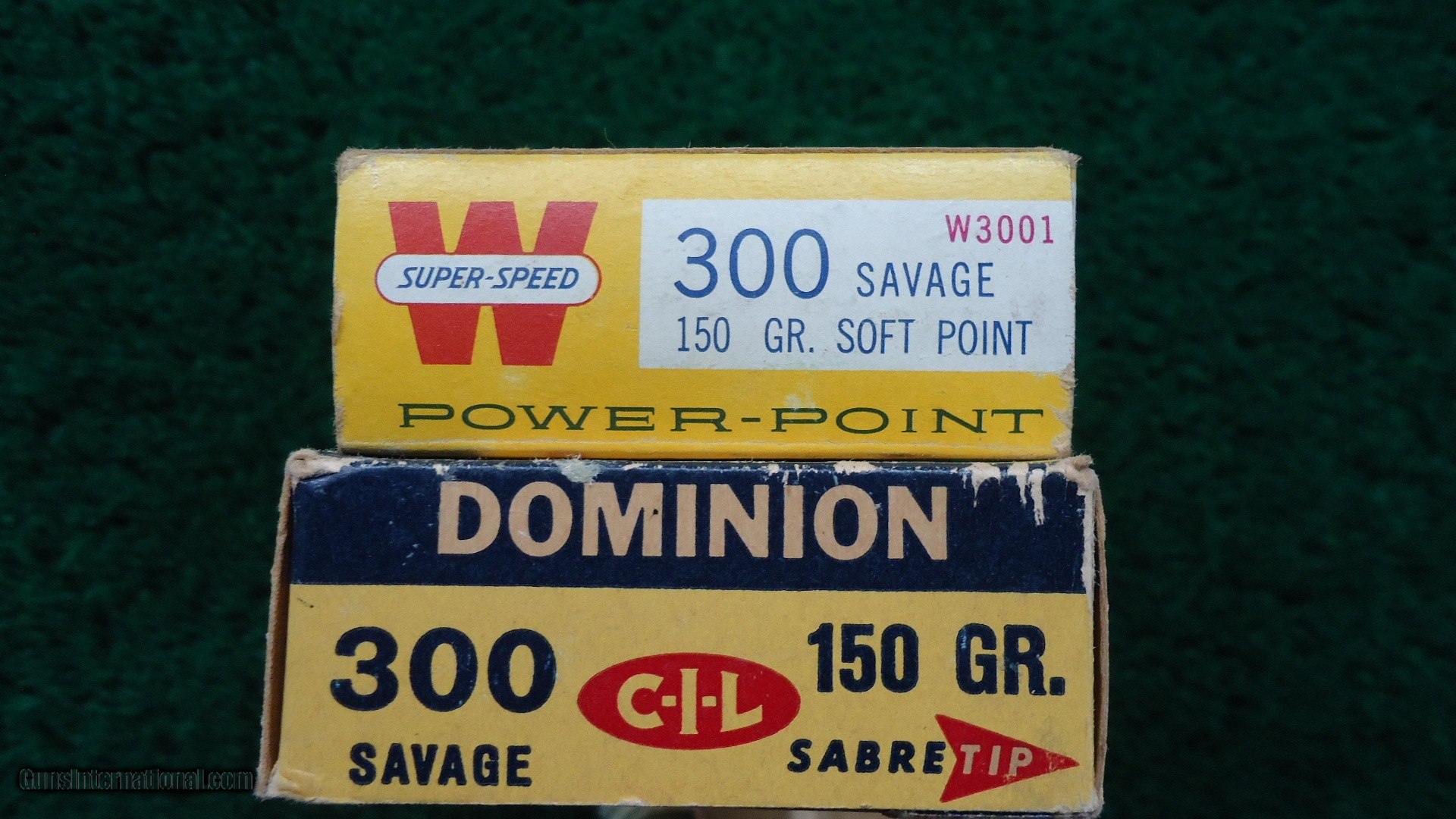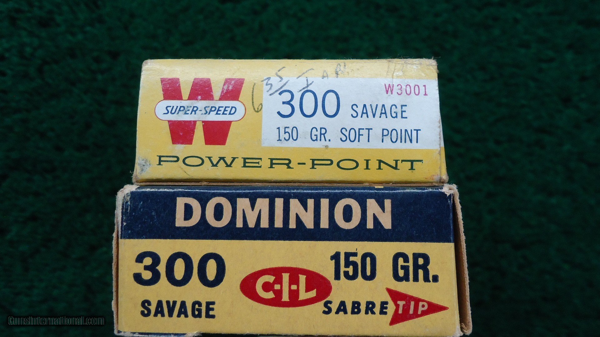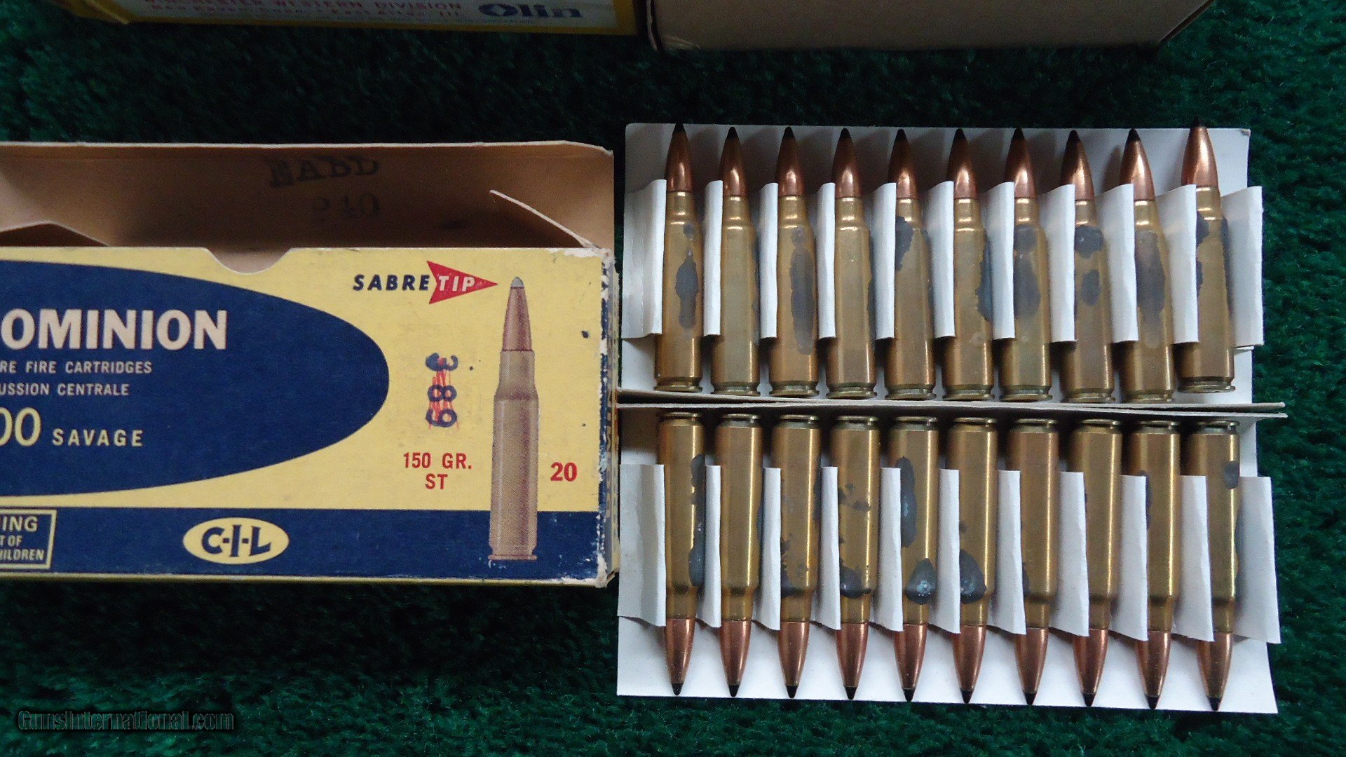 Description: 1 full box of 20 rounds of Winchester brand 300 SAVAGE 150 Grain Soft Point Bullets. 1 full box of Dominion brand 150 Grain Sabre Tip Bullets. Some spots of corrosion on the Dominion rounds. 40 rounds total. Free Shipping. Leroy Merz Antique Firearms specializes in antique and vintage Winchesters and other fine American firearms. Since 1965 Mr. Merz has taken part in the world of firearms and has been a contributor to many well known reference books. We have hundreds of additional guns in every price range at our home online. Search for Merz Antiques in google. SOLD Rifle Caliber: .300 Savage |