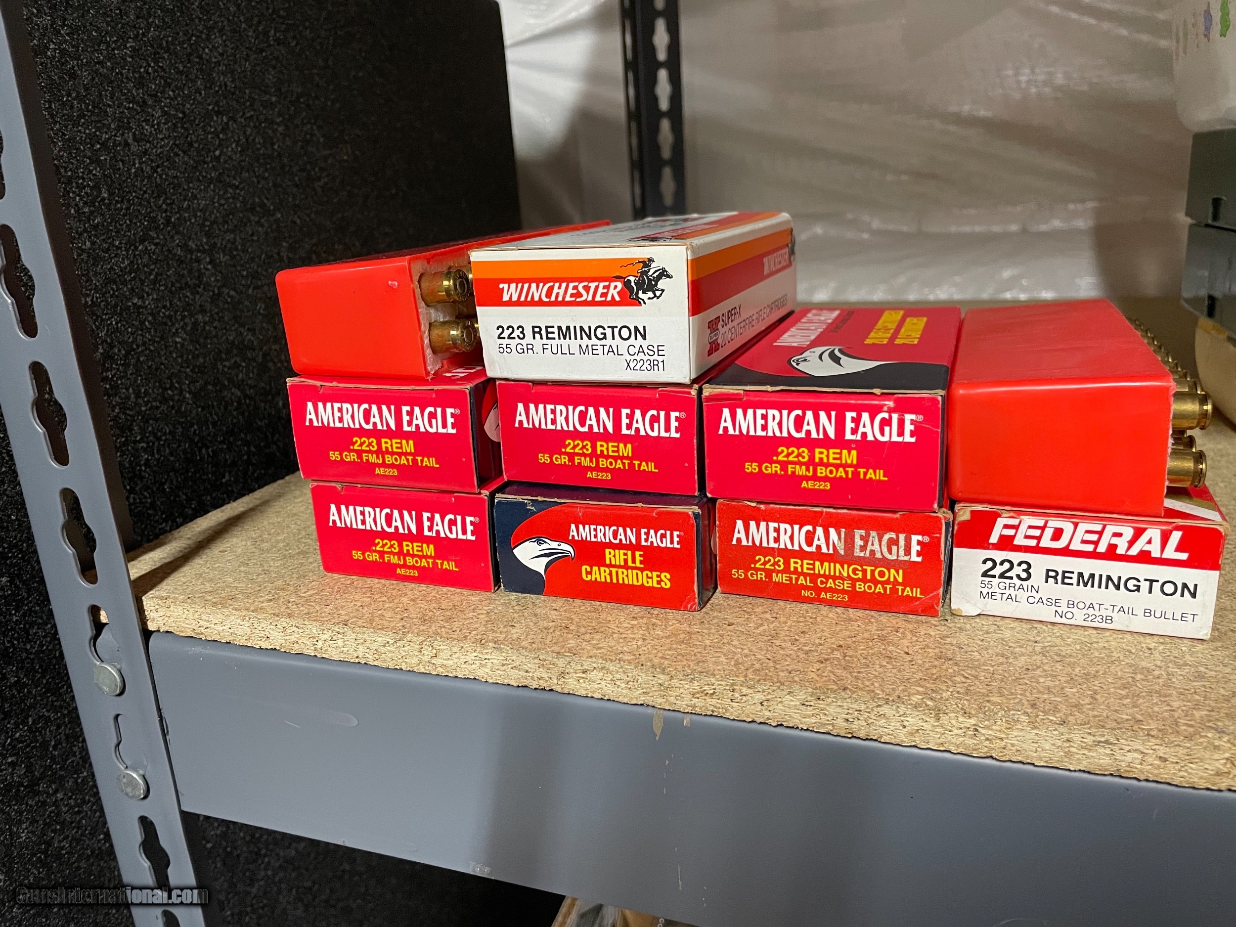 Description: Ten boxes of 223 cal all factory brand name ammunition SOLD Rifle Caliber: .223 Remington |