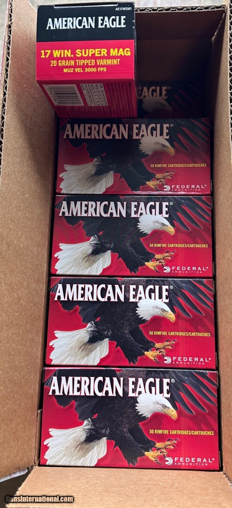 Description: I have two cases left of Federal American Eagle 17 WSM 20 gr ammo. 50 rounds per box and ten boxes per case. Price includes standard ground shipping where legal in the lower 48 states. If your local laws have special restrictions etc, it will be YOUR responsibility to provide me with what is required before shipping. Please call, text or email me with any questions. Buy with confidence, I'm fairly new to selling on this forum but have several hundred positive feedback on other sites. I accept bank checks, money orders(USPS preferred) or Zelle for payment. No other form of payments accepted. . SOLD Rifle Caliber: .17 WSM |