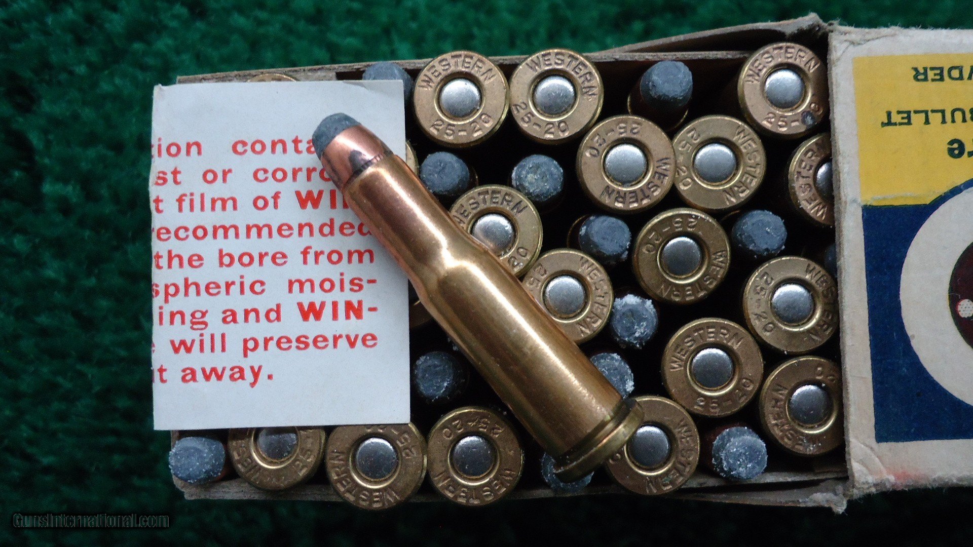 Description: 2-50 round boxes of Western brand 25-20 Winchester caliber 86 grain soft point bullet cartridges. Leroy Merz Antique Firearms specializes in antique and vintage Winchesters and other fine American firearms. Since 1965 Mr. Merz has taken part in the world of firearms and has been a contributor to many well known reference books. We have hundreds of additional guns in every price range at our home online. Search for Merz Antiques in google. SOLD Rifle Caliber: .25-20 Winchester |