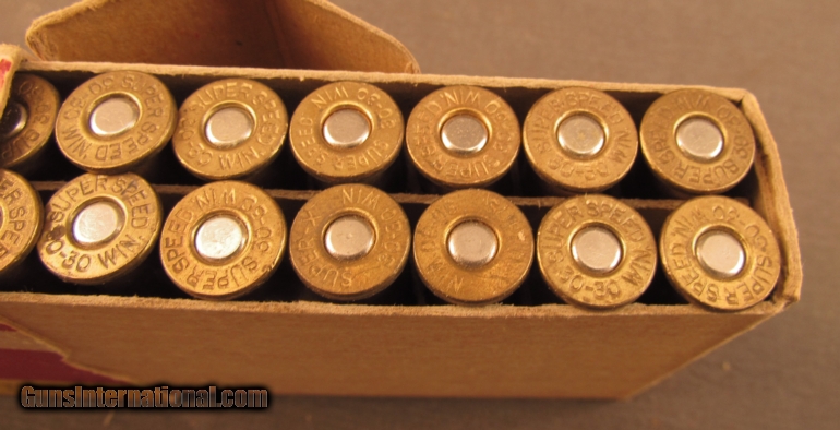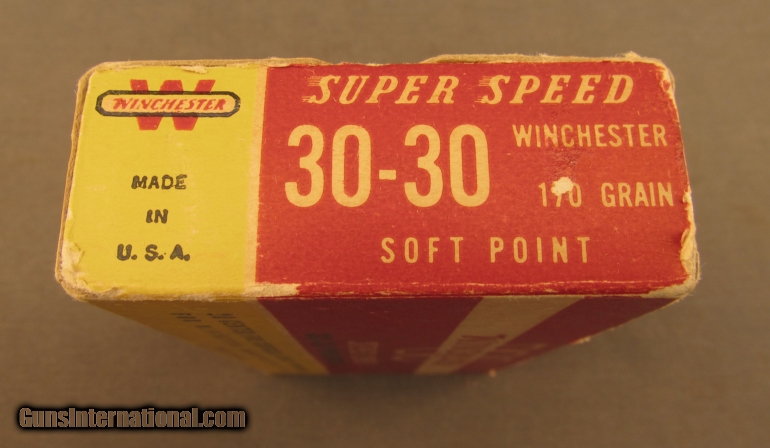 Description: A red, yellow and blue printed flap box with 20 rounds.30-30, 170 grain soft point ammunition. Some mixed super x ammo in the box. SOLD Manufacturer: Winchester Model: Ammo Caliber Info: .30-30 Gauge Info: .30-30 |